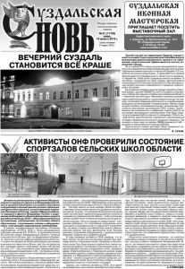 Газета основана 21 марта 1918 г. № 61 (11706) среда, 10 августа 2016 г. Общественно политическая газета СУЗДАЛЬСКАЯ ИКОННАЯ МАСТЕРСКАЯ Адрес выставочного зала: г. Суздаль, ул.Кремлевская, д. 10-Г ТК «Подворье мастеров» с 10.00 до 18.00 www.suzdalikon.com Реклама ПРИГЛАШАЕТ ПОСЕТИТЬ ВЫСТАВОЧНЫЙ ЗАЛ Третий год уже на территории Суздаля осуществляетсясовместная(городскихвластейиМинэнерго) реализация демонстрационного проекта по повышению энергетической эффективности систем освещения города. За это время 375 старых уличных фонарей были заменены на современные энергосберегающие светильники. Сделанная замена приносит в городской бюджет 2,5 тыс. рублей экономии каждый день. А сама работа по замене финансируется из федерального, областного и городского бюджетов. Свою долю суздальцы вносят исправно. И как бонус, поощрение за такой подход, местные власти получили дополнительную возможность (без материальных затрат) улучшить освещённость городских территорий и построек. Было решено придать архитектурную подсветку Торговым рядам, зданию ОМВД России по Суздальскому району и обоим заставным столбам (все названные объекты – памятники архитектуры). Минэнерго провело огромную подготовительную работу: организовало конкурс на подряд, согласовало будущую деятельность со всеми надзирающими организациями и ведомствами. Месяц назад за дело взялась, выигравшая конкурс, московская строительно-монтажная организация ООО «Смарт Групп». Именно её специалисты и завершают сейчас работы по установке светодиодных светильников. Они будут зажигаться в режиме работы уличного освещения. Оплата потреблённой архитектурной подсветкой электроэнергии не будет обременительной для городского бюджета. Так мощность всех ламп на здании ОМВД равняется 2 кВт – мощности обыкновенного электрочайника. Окончательно новый световой облик названные постройки получат в самое ближайшее время. В. СУХОВ. ВЕЧЕРНИЙ СУЗДАЛЬ СТАНОВИТСЯ ВСЁ КРАШЕ Активисты регионального отделения Общероссийского народного фронта во Владимирской области провели мониторинг состояния спортивных сооружений в сельских школах региона. Целью мониторинга был контроль за выполнением поручения Президента России, лидера Общероссийского народного фронта Владимира Путина о выделении необходимого объема финансовых средств для обеспечения до 2016 г. общеобразовательных организаций, реализующих программы общего образования, спортивными залами и оборудованием, отвечающим современным требованиям. В рамках государственной программы «Развитие образования» на 2013–2020 гг. были распределены субсидии регионам РФ. В 2015 г. в программу вошли 54 сельских школы Владимирской области, которые получили почти 24 млн. руб. из федерального бюджета, всего же с учетом софинансирования из областного и местных бюджетов объем реализации программы в регионе составил почти 36 млн. руб. На эти средства был проведен ремонт спортивных залов в 48 школах на селе, в 5 – под спортивные залы перепрофилированы имеющиеся аудитории, в 34 – построены и оснащены открытые плоскостные спортивные сооружения на территории школы. В ходе мониторинга общественники посетили 12 сельских школ в 6 муниципальных образованиях региона. «Мы хотели посмотреть, насколько эффективно использованы выделенные бюджетные средства, какие условия для занятий физкультурой и 