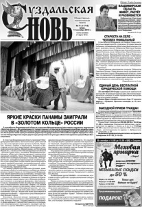 Газета основана 21 марта 1918 г. № 71 (11716) среда, 14 сентября 2016 г. Общественнополитическая газета В этом году Владимирская область принимает Международный фестиваль «Золотое кольцо» уже в шестой раз. Его участниками стали артисты из Китая, Германии, Панамы, Сербии и Черногории. Россию на фестивале на этот раз представляет фольклорно-этнографический ансамбль «Марий памаш» из Республики Марий Эл, а также коллективы Владимирской области - детская студия «Русь», ансамбль «Владимирские рожечники» областного Центра народного творчества и народный ансамбль танца «Росинка» Владимирского областного колледжа культуры и искусства. Этнографические, молодёжные фольклорные ансамбли разных стран представят на фестивале различные виды и жанры народной культуры: инструментальный, музыкально-песенный, танцевальный, игровой, ярмарочный фольклор, народный эпос. «От имени Губернатора Светланы Орловой, администрации области и культурного сообщества нашего региона приветствуем на гостеприимной Владимирской земле замечательные коллективы, которые привезли свои программы не только из разных стран, но и с разных континентов. Понимая огромное историческое значение нашей земли, мы с большим вниманием относимся к культурным форумам и фестивалям. В год мы принимаем более 30 событий международного и национального масштаба. Уверен, что жители региона очень радостно воспримут ваше творчество, потому что у нас очень благодарный зритель – не только во Владимире, но и во всех даже самых небольших населённых пунктах. Желаю вам всем вдохновения и ярких впечатлений!», – обратился к участникам фестиваля Михаил Колков. Фестиваль «Золотое кольцо» проводится в соответствии с планом основных мероприятий Министерства культуры России, Государственного Российского Дома народного творчества, Комитета по сохранению нематериального культурного наследия при Комиссии по делам ЮНЕСКО и департамента культуры администрации Владимирской области. Он нацелен на популяризацию и развитие самобытной музыкально-песенной, танцевальной, празднично-обрядовой и семейно-бытовой культуры. За 15 лет существования фестиваля в нем приняло участие более 200 творческих коллективов со всего мира. В Суздальском районе в рамках этого фестиваля 8 сентября в Доме культуры села Новое прошёл концерт фольклорной группы из Панамы. Гостей из Панамы встречали работники Дома культуры по русскому обычаю с хлебом-солью во главе с директором В.М. Русаковым, заслуженным работником культуры РФ, Почётным гражданином Суздальского района. На концерт собрались приглашённые гости – жители сел Новое, Ославское, Суворотское и ученики новосельской школы. С приветственным словом к гостям обратилась начальник отдела по культуре, спорту, семьи и молодёжной политике администрации Суздальского района Г.В. Ильина. Фольклорная группа ПАНАМА – это коллектив, в составе которого работают профессиональные танцоры и музыканты. Перед началом концерта под ритмический бой барабанов артисты начали разучивать на сцене вместе с приглашёнными зрителями свой национальный танец. Зрители в зале громкими аплодисментами поддерживали своих односельчан. Концерт длился больше часа. Восхищаясь уникальной хореографией, зрители неоднократно приветствовали артистов криками «браво». Техника танцев была просто вирту