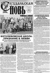 Газета основана 21 марта 1918 г. № 79 (11724) среда, 12 октября 2016 г. Общественнополитическая газета В первом томе Историко-статистического описания церквей приходов Владимирской Епархии сообщается, что «в селе имеется народное училище; в первый раз оно открыто в 1842 г. местным диаконом и помещалось в крестьянских домах; в настоящее время помещается в особом каменном доме при церкви и содержится на средства земства; учащихся ежегодно около 70 человек». Двухэтажное здание народного училища было построено в 1864 г. Шли годы, школа меняла адреса. В 1976 году было выстроено новое здание по улице Ленина, дом № 26-А. Теперь здесь обучается более 400 учащихся из пос. Боголюбово, сел Суромна и Лемешки. Когда-то при школе выращивали цыплят, а овощи и фрукты пришкольного участка возили в Москву на ВДНХ. Школьная самодеятельность колесила по окрестным деревням со спектаклем по пьесе Михалкова «Я хочу домой». Педагоги сотрудничали с Академией наук и апробировали новые учебники и программы. В современной школе трудится высокопрофессиональный коллектив. На сегодняшний день здесь работают 44 человека, 19 из них – выпускники школы. Из 36 педагогов 12 имеют высшую квалификационную категорию, 20 – первую. В день юбилея на школьном празднике присутствовали ветераны педагогического труда, официальные БОГОЛЮБОВСКАЯ ШКОЛА: ПРИЗНАНИЕ В ЛЮБВИ ВЛАДИМИРСКОЙ ОБЛАСТИ ПРИСВОЕНА 1 СТЕПЕНЬ КАЧЕСТВА УПРАВЛЕНИЯ РЕГИОНАЛЬНЫМИ ФИНАНСАМИ В 2015 ГОДУ За высокое качество управления региональными финансами в 2015 году Владимирской области присвоена 1 степень качества. «Накопленная в регионе лучшая практика организации бюджетного процесса может быть использована для внедрения в других субъектах Российской Федерации», - отметила в письме Губернатору Светлане Орловой директор департамента межбюджетных отношений Министерства финансов России Лариса Ерошкина, который проводил мониторинг и оценку качества управления региональными финансами. ВО ВЛАДИМИРСКОЙ ОБЛАСТИ СТАРТОВАЛ МЕЖДУНАРОДНЫЙ ФОРУМ «РОССИЯ - СПОРТИВНАЯ ДЕРЖАВА» 10 октября во Владимирской области начал свою работу VI Международный спортивный форум «Россия - спортивная держава». Его участниками являются представители Правительства России, Государственной Думы и Совета Федерации, федеральных и региональных органов исполнительной власти, международных, федеральных и региональных общественных организаций в сфере физической культуры и спорта, топ-менеджеры коммерческих организаций спортивной индустрии, представители научно-экспертного сообщества и образовательных организаций в сфере физической культуры и спорта, действующие спортсмены и известные атлеты. Открылся форум на площадке Владимирского государственного университета международной научно-практической конференцией «Всероссийский физкультурноспортивный комплекс «Готов к труду и обороне» (ГТО) и массовый спорт в системе здорового образа жизни населения», там же состоялось открытие фестиваля «Дни самбо во Владимирской области» Главное отличие VI форума «Россия - спортивная держава» от предыдущих - то, что основные его мероприятия пройдут в Городе воинской славы Коврове, а также в городе Доброград Ковровского района, а не в столице региона. Там уже состоялись форсайт-сессия «Человеческий капитал. Основа устойчивого развития спортивной отрасли», обсу