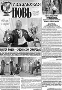 Газета основана 21 марта 1918 г. № 94 (11739) пятница, 2 декабря 2016 г. Общественнополитическая газета ВИКТОР ЯКУБОВ - СУЗДАЛЬСКИЙ САМОРОДОК УВАЖАЕМЫЕ ЖИТЕЛИ СУЗДАЛЬСКОГО РАЙОНА! Решением Генеральной Ассамблеи ООН 3 декабря отмечается как Международный день инвалидов. В этот день мы уделяем особое внимание проблемам и заботам живущих среди нас людей с ограниченными возможностями. Очень важно, чтобы каждый человек, независимо от состояния здоровья, мог стать полноправным членом общества, мог трудиться, реализовывать свои знания, профессиональный опыт и приносить пользу обществу. С каждым годом государством, органами местного самоуправления, общественными организациями и предприятиями процессу интеграции людей с ограниченными возможностями в политическую, социально-экономическую и культурную жизнь уделяется всё больше внимания. В работе администрации Суздальского района всегда было и остается приоритетным направление на реабилитацию и всестороннюю помощь людям, находящимся в трудных жизненных обстоятельствах из-за проблем со здоровьем. Большой вклад в решение проблем людей с ограниченными возможностями, создание необходимых условий для их общения и обмена жизненным опытом вносят отдел социальной защиты населения по Суздальскому району, Суздальское районное отделение Всероссийского общества инвалидов и ветеранские организации. Мы искренне благодарим всех, кто дарит тепло и внимание людям с ограниченными возможностями. Выражаем искреннюю признательность людям, имеющим ограничения в здоровье, за их стойкость, силу духа, способность на протяжении многих лет противостоять жизненным трудностям. Ваше мужество и жизнелюбие достойны уважения и восхищения! От всего сердца желаем вам крепкого здоровья, счастья, оптимизма, благополучия, любви, мира и тепла! А.П. САРАЕВ, Глава Суздальского района. В.В. КИРИЛЛОВ, председатель Совета народных депутатов Суздальского района. ДОРОГИЕ ДРУЗЬЯ! 3 ДЕКАБРЯ ВО ВСЕХ СТРАНАХ МИРА ОТМЕЧАЕТСЯ МЕЖДУНАРОДНЫЙ ДЕНЬ ИНВАЛИДОВ. Этот день - напоминание всем нам, что цивилизованным и гуманным может считаться только то общество, в котором тепло и заботливо относятся ко всем людям, независимо от их физических возможностей. Россия ратифицировала международную Конвенцию «О правах инвалидов». Задача государства – кардинально изменить ситуацию к лучшему, создать людям с ограниченными возможностями необходимые условия для активной, полноценной, достойной жизни. Во Владимирской области проживает более 140 тысяч людей, которые нуждаются в особой заботе. В регионе сформирован комплекс мер, направленных на решение проблем людей с инвалидностью, их реабилитацию, обеспечение равенства и полноправного участия в жизни общества. Действует государственная программа «Доступная среда». В рамках её реализации мы стремимся обеспечить доступность объектов и услуг в социальной, инженерной и транспортной инфраструктурах. Важно, чтобы инвалиды имели возможность общаться, получать образование, найти работу, самостоятельно передвигаться по городу. Только тогда достигаются общественно приемлемые результаты, когда есть понимание и взаимодействие между органами власти всех уровней и гражданским обществом. Совместная работа с общественными организациями помогает людям с ограниченными возможностями проявить св