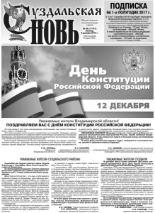 Газета основана 21 марта 1918 г. № 96 (11741) пятница, 9 декабря 2016 г. Общественнополитическая газета УВАЖАЕМЫЕ ЖИТЕЛИ СУЗДАЛЯ! В декабре наша страна отмечает две очень значимые праздничные даты: День Героев Отечества и День Конституции Российской Федерации. 9 декабря 1769 года императрица Екатерина II учредила орден Святого Георгия Победоносца. Орденом награждались воины, проявившие мужество и доблесть в бою. Благодаря их мужеству и самоотверженности, мы можем с уверенностью смотреть в будущее, гордиться своей страной и ее историей. Благодаря им построено государство, где высшей ценностью провозглашен гражданин, его интересы и права, что закреплено в основополагающем законе – Конституции Российской Федерации. Конституция стала основой всех прогрессивных преобразований в России. Она дает возможность каждому из нас определять свою судьбу и активно участвовать в жизни общества. Призываем каждого суздальца задуматься о своей ответственности за процветание родного города, России, за соблюдение конституционных норм, за настоящее и будущее страны. В эти праздничные дни Совет народных депутатов и администрация города Суздаля желают всем уверенности в завтрашнем дне, мира и согласия, стабильности и благополучия, реализации новых смелых проектов и замыслов на благо страны. Л.В. МАЙОРОВА, глава города Суздаля. С.В. САХАРОВ, глава администрации города Суздаля. УВАЖАЕМЫЕ ЖИТЕЛИ СУЗДАЛЬСКОГО РАЙОНА! 23 года назад в этот день всенародным голосованием был принят Основной Закон нашего государства. Этот день изменил жизнь нашего государства и его граждан. Появилась и была реализована возможность создания нового политического устройства Российской Федерации, для формирования властей всех уровней были организованы свободные прямые выборы на многопартийной основе. Конституция современной России объявила человека, его права и свободы высшей ценностью, заложила прочный фундамент для обеспечения мира и согласия в нашем обществе. Она выступила гарантом демократии, независимости и целостности нашего государства. Основной Закон стал основой дальнейшего успешного развития экономической, социальной и культурной сфер страны. УВАЖАЕМЫЕ ЗЕМЛЯКИ! Впереди у всех нас очень много работы по социально-экономическому обустройству России, нашей любимой Владимирской области. У нас непростые задачи и большие планы на ближайшую и дальнюю перспективу. От всей души желаем вам мирного труда, свободной и счастливой жизни, крепкого здоровья и веры в будущее! С.С. МАМЕЕВ, главный федеральный инспектор по Владимирской области аппарата полномочного представителя Президента РФ в Центральном федеральном округе. Уважаемые жители Владимирской области! ПОЗДРАВЛЯЕМ ВАС С ДНЁМ КОНСТИТУЦИИ РОССИЙСКОЙ ФЕДЕРАЦИИ! С.Ю. ОРЛОВА, Губернатор Владимирской области. В.Н. КИСЕЛЁВ, председатель Законодательного Собрания Владимирской области. 9 декабря мы будем отмечать День Героев Отечества, а 12 декабря - День Конституции Российской Федерации. От имени администрации и Совета народных депутатов Суздальского района разрешите поздравить вас с этими знаменательными праздниками. День Героев Отечества – это дань глубочайшего уважения нашим согражданам, удостоенным высших государственных наград Родины. Их подвиги и свершения – образец доблести и отваги, мужества и героизма, ярк