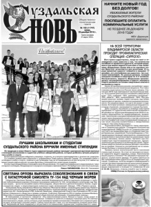 Газета основана 21 марта 1918 г. № 102 (11747) среда, 28 декабря 2016 г. Общественнополитическая газета НАЧНИТЕ НОВЫЙ ГОД БЕЗ ДОЛГОВ! УВАЖАЕМЫЕ ЖИТЕЛИ СУЗДАЛЬСКОГО РАЙОНА! ПОСПЕШИТЕ ОПЛАТИТЬ КОММУНАЛЬНЫЕ УСЛУГИ НЕ ПОЗДНЕЕ 28 ДЕКАБРЯ 2016 ГОДА! МБУ «Дирекция единого заказчика». НА ВСЕЙ ТЕРРИТОРИИ ВЛАДИМИРСКОЙ ОБЛАСТИ ПРОХОДИТ ПРОФИЛАКТИЧЕСКАЯ ОПЕРАЦИЯ «СУРРОГАТ» Вся страна содрогнулась, когда из газет и телевидения стало известно о том, что количество погибших от ядовитого суррогата, который продавался под видом жидкости для ванн и под названием «Боярышник» более чем в ста торговых точках Иркутска, исчисляется уже десятками. В городе ядовитый суррогат появился в продаже 17 декабря, его употребляли как одиночно, так и целыми компаниями. По разным данным, полиция находила погибших в квартирах по 3-4 человека. Как выяснилось, жидкость «Боярышник» производилась несанкционированно и вместо этилового спирта делалась на основе смертельно опасного метилового спирта. Около 30 миллионов россиян употребляют суррогатный алкоголь или технические жидкости. Рост алкоголизма и преступности в России тесно связаны. Статистика 2016 года преподносит неутешительные факты. В состоянии алкогольного опьянения совершается: краж – 55%, грабежей – 80%, разбойных нападений – 70%, убийств – 80%, изнасилований – 80%. Под влиянием алкоголя человек теряет контроль над собой, притупляются чувства, появляется ощущение всесильности. Он искренне верит, что никто не узнает о содеянном. Хотя преступления, совершенные людьми в состоянии опьянения, раскрываются гораздо быстрее. Дабы оградить население (а впереди новогодние праздники) от суррогатной алкогольной продукции с 20 декабря на территории Владимирской области начались мероприятия по предупреждению, выявлению, пресечению и документированию фактов реализации через фармацевтические и торгово-розничные сети контрафактной спиртосодержащей продукции, в том числе лосьонов косметических и лекарственных средств «Настойка боярышника». Полномасштабно проводятся такие мероприятия в Суздальском районе. Сотрудники большинства подразделений ОМВД России по Суздальскому району (часто во взаимодействии со специалистами территориальных управлений Роспотребнадзора и Росздравнадзора) проводят мероприятия, направленные на выявление и пресечение фактов реализации через аптеки, магазины, киоски, рынки, торговли с рук контрафактной спиртосодержащей продукции, предназначенной для бытовых и гигиенических целей. Параллельно ведутся разъяснительные беседы с населением на предмет опасности употребления не по назначению бытовых и гигиенических средств. Уровень жизни значительной части населения страны ещё не высок. Но стоит ли экономия на покупке суррогата вашего здоровья, жизни, благополучия ваших родных и близких? Не забывайте народную мудрость: скупой платит дважды. Не дайте нажиться на вас производителям суррогата и не порядочным торгашам. Суздальцы, если вы владеете информацией о случае торговли подозрительной алкогольной продукцией, отбросьте неуместную скромность, сообщите о ваших подозрениях в полицию по телефонам 02 или 2-12-35. Возможно, этим вы спасёте чью то жизнь! ОМВД России по Суздальскому району. По традиции в канун Нового года в администрации района проходит церемония вручения именных стипендий школьникам и с