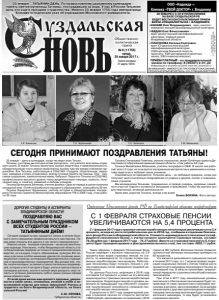 Газета основана 21 марта 1918 г. № 6 (11755) среда, 25 января 2017 г. Общественнополитическая газета ООО «Надежда+» Клиника «ТВОЙ ДОКТОР» г.Владимир 28 ЯНВАРЯ С 9.00 В ПОЛИКЛИНИКЕ НА БАЗЕ СУЗДАЛЬСКОЙ РБ БУДУТ ВЕСТИ КОНСУЛЬТАТИВНЫЙ ПРИЕМ ВРАЧИ-СПЕЦИАЛИСТЫ ИЗ г. ВЛАДИМИРА: •КАНАЕВ Олег Владимирович - врач-онкологмаммолог высшей квалификационной категории •ФЕДИН Олег Вячеславович - врач-уролог высшей квалификационной категории, главный уролог Владимирской области •ПЛАТОНОВА Наталья Сергеевна - врач УЗ-диагностики высшей квалификационной категории (УЗИ органов брюшной полости, простаты, УЗИ щитовидной и молочных желез, УЗИ гинекологическое) ПРИЁМ ПЛАТНЫЙ - по предварительной записи по телефону: 8 (49231) 2-01-22 Информация о клинике на сайте: www.tvoi_doctor33.ru ВНИМАНИЕ! ИМЕЮТСЯ ПРОТИВОПОКАЗАНИЯ, ПРОКОНСУЛЬТИРУЙТЕСЬ СО СПЕЦИАЛИСТОМ Лиц. №ЛО-33-01-001691 от 17.10.2014 выд. деп. здравоохр. адм. Влад. обл. Реклама 25 января – ТАТЬЯНИН ДЕНЬ ТАТЬЯНИН ДЕНЬ. По православному церковному календарю – . По православному церковному календарю – память святой мученицы Татианы, пострадавшей за веру. У нас в России Татьянин день это еще и праздник студенчества. Именно 25 января 1755 года императрица Елизавета подписала указ об учреждении Московского университета. 25 января – день в календаре, когда чествуют всех Татьян. Татьяны, о которых мы сегодня хотим рассказать - это учителя, всю жизнь отдавшие школе. В имени Татьяна заключена особая энергетика и привлекательность, обладательницам этого имени свойственны особое чувство юмора и великое трудолюбие. Все Татьяны, работающие в СОШ №2 г.Суздаля, общительные, задорные, заводные и очень отзывчивые, всегда готовые прийти на помощь. Они – красивые суздалянки, замечательные мамы, бабушки. Педагоги-Татьяны из СОШ №2, профессионалы высокого уровня, чему свидетельствуют награды, грамоты, полученные ими, и, конечно, уважение и любовь учеников. Татьяна Евгеньевна Зинякова, учитель физики. Одна из первых в школе получила нагрудный знак «Почётный работник народного образования», стаж работы 39 лет. Татьяна Захаровна Чернышева, учитель истории и обществознания. Награждена Почётной грамотой Министерства образования РФ в 2006 году, стаж работы 32 года. Татьяна Степановна Телегина, учитель технологии, имеет Почётную грамоту Департамента образования администрации области, стаж работы 34 года. Татьяна Михайловна Мякишева, учитель географии и ОБЖ. В школе она работает всего 3 года, но пользуется заслуженным авторитетом и уважением в коллективе педагогов и любовью своих учеников. Сомневаться не приходится: Татьянин день – их любимый праздник, когда они получают многочисленные поздравления от родных и друзей, коллег и знакомых, своих учеников. Мы желаем всем Татьянам, традиционно, в первую очередь, здоровья, семейного счастья! Надолго оставаться молодыми и красивыми, чтобы им хватало сил для творческой, активной деятельности! Удачи вам, дорогие Татьяны, всегда и во всем! Елена ФОКИНА. Фото автора. СЕГОДНЯ ПРИНИМАЮТ ПОЗДРАВЛЕНИЯ ТАТЬЯНЫ! ДОРОГИЕ СТУДЕНТЫ И АСПИРАНТЫ ВЛАДИМИРСКОЙ ОБЛАСТИ! ПОЗДРАВЛЯЮ ВАС С ЗАМЕЧАТЕЛЬНЫМ ПРАЗДНИКОМ ВСЕХ СТУДЕНТОВ РОССИИ – ТАТЬЯНИНЫМ ДНЁМ! Сегодня каждый из вас находится только в начале большого пути к вершинам профессионального мастерства. Перед вами открыты все дороги и нет ничего невозможного! Именно на вас - молодое 