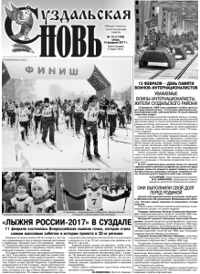 Газета основана 21 марта 1918 г. № 13 (11762) среда, 15 февраля 2017 г. Общественнополитическая газета Впервые на лыжню вышли 35 лет назад и с тех пор эти соревнования стали у народа самыми массовыми и любимыми. Проходят они с того времени - ежегодно. Основная цель данного спортивного мероприятия - приобщение граждан к здоровому образу жизни, к занятиям спортом, в частности, лыжным. В Суздале «Лыжня России» проходила по Ильинскому лугу. Участников и зрителей действа приветствовали Сергей Сахаров, глава администрации г. Суздаля и заместитель председателя Горсовета, председатель Совета отцов Сергей Родионов. Соревнования открыли дети от 6 лет и старше - юные участники гонки. Самым маленьким спортсменам - Матвею Шувалову, которому 3,5 года и Маше Мымриной 4-х лет, - помогали родители. По самым скромным подсчетам в лыжной гонке приняли участие более ста участников в возрасте от 6 до 70 лет, которые участвовали в забеге от 1 до 5 км. Администрация города постаралась, чтобы спортивное мероприятие прошло весело, интересно, не скучно. Участники забега, зрители могли выпить чаю, посмотреть выступления коллективов ЦКД г. Суздаля. По мнению многих участников забега все в этом году было организовано просто отлично, так что спасибо организаторам! Люди получили массу положительных эмоций, зарядились здоровьем и хорошим настроением. После забега победители гонки были отмечены призами и наградами. М.СЕМЕНОВА. Фото А. Алекина. «ЛЫЖНЯ РОССИИ-2017» В СУЗДАЛЕ 11 февраля состоялась Всероссийская лыжная гонка, которая стала самым массовым забегом в истории проекта в 33-м регионе Самые маленькие лыжники – участники забега. К. Казачкин – неоднократный победитель «Лыжни России» в Суздале в своей возрастной категории. В лыжном забеге в Суздале приняли участие более 100 человек. УВАЖАЕМЫЕ ВОИНЫ-ИНТЕРНАЦИОНАЛИСТЫ, ЖИТЕЛИ СУЗДАЛЬСКОГО РАЙОНА! 15 февраля 1989 года занимает особое место в истории нашей страны – в этот день закончилась война в Афганистане, унёсшая более 15 тысяч жизней советских солдат. Лучшие боевые качества проявили воины и сотрудники органов внутренних дел, защищая дружественный афганский народ, а также в вооруженных конфликтах в Северной Осетии, Ингушетии, Чеченской Республике и Таджикистане. За боевые подвиги на полях сражений в «горячих точках» наши земляки имеют около 170 орденов и медалей. Уважаемые воины-интернационалисты и участники локальных войн! Мы по праву гордимся вашим солдатским мужеством, подлинным героизмом, стойкостью духа, самоотверженностью, отдавая дань глубокого уважения вашим заслугам, вашему солдатскому подвигу. Вы с честью выполнили свой воинский и интернациональный долг, прошли испытание огнем, подтвердили свою верность боевым традициям старших поколений. Низко склоняем голову перед погибшими, перед теми, кто исполнил свой воинский и гражданский долг ценой собственной жизни. Мы помним каждое имя и вместе с родными и близкими разделяем боль и горечь утрат. В этот памятный день желаем всем кто прошел горнило войн и военных конфликтов, всем кто ждал и верил, всем кто помнит и хранит память о тех событиях счастья, здоровья, успехов, семейного тепла, благополучия и мирного неба над головой. А.П.САРАЕВ, Глава Суздальского района. В.В. КИРИЛЛОВ, председатель Совета народных депутатов Суздальского района. 15 ФЕВРАЛЯ – ДЕНЬ ПАМЯТИ ВОИНОВ-ИНТ
