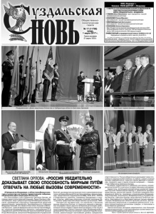 Газета основана 21 марта 1918 г. № 17 (11766) среда, 1 марта 2017 г. Общественнополитическая газета 22 февраля во Владимире, в областном Дворце культуры и искусства состоялось торжественное собрание, посвященное Дню защитника Отечества. Его участниками стали Губернатор Светлана Орлова, её первые заместители Алексей Конышев, Лидия Смолина и Вячеслав Кузин, вице-губернаторы Сергей Невзоров и Роман Русанов, руководители структурных подразделений областной администрации, председатель Законодательного Собрания Владимир Киселёв, его заместители Ольга Хохлова и Вячеслав Картухин, главный федеральный инспектор Сергей Мамеев, начальник Владимирского гарнизона, командующий 27-й гвардейской ракетной Витебской Краснознаменной армией Игорь Фазлетдинов, митрополит Владимирский и Суздальский Евлогий, руководители органов местного самоуправления региона, ветераны Великой Отечественной войны, военнослужащие, представители подразделений МВД, ФСБ, МЧС, УФСИН и Следственного комитета, сотрудники прокуратуры и силовых структур, работники различных отраслей экономики 33го региона, представители общественных организаций, СМИ. «Сегодня мы чествуем всех, кто причастен к высокому званию защитника России: от покрытых сединой и увенчанных наградами наших дорогих ветеранов до молодых ребят, которые только недавно надели военную форму, в том числе и наши юнармейцы. Сейчас страна во главе с Владимиром Владимировичем Путиным испытывает огромный подъём патриотизма, демонстрирует высочайший уровень гражданской СВЕТЛАНА ОРЛОВА: «РОССИЯ УБЕДИТЕЛЬНО ДОКАЗЫВАЕТ СВОЮ СПОСОБНОСТЬ МИРНЫМ ПУТЁМ ОТВЕЧАТЬ НА ЛЮБЫЕ ВЫЗОВЫ СОВРЕМЕННОСТИ!» ответственности. Россия убедительно доказывает свою способность мирным путём отвечать на любые, самые сложные вызовы современности, помогать своим друзьям и союзникам, сохранять мир в самой сложной ситуации!», – подчеркнула Губернатор Светлана Орлова. В рамках торжественного собрания состоялось награждение жителей 33-го региона государственными наградами. Кроме того, за большой личный вклад в развитие традиций Русской Православной Церкви и укрепление духовнонравственных ценностей звание «Почётный гражданин Владимирской области» присвоено управляющему Владимирской епархией, митрополиту Владимирскому и Суздальскому Евлогию. Светлана Орлова также вручила Почётные грамоты, Благодарности и Благодарственные письма администрации Владимирской области жителям региона, достигшим высоких результатов в служебной деятельности, в военно-патриотическом воспитании граждан, в поисковом и волонтёрском движении. Заключительным аккордом мероприятия стал большой праздничный концерт с участием ведущих коллективов и исполнителей Владимирской области. Пресс-служба администрации области. Фото В. ЕДУНОВА. Митрополит Владимирский и Суздальский Евлогий – Почетный гражданин Владимирской области. Поздравление с Днем защитника Отечества от Губернатора области Светланы Орловой. На праздничном концерте. Выступает Владимир Киселёв, председатель ЗС области. Участники торжественного собрания. ООО «Надежда+» Клиника «ТВОЙ ДОКТОР» г.Владимир 11 МАРТА С 9.00 В ПОЛИКЛИНИКЕ НА БАЗЕ СУЗДАЛЬСКОЙ РБ БУДУТ ВЕСТИ КОНСУЛЬТАТИВНЫЙ ПРИЕМ ВРАЧИ-СПЕЦИАЛИСТЫ ИЗ г. ВЛАДИМИРА: • ГУБКИНА Ольга Николаевна - врач-эндокринолог высшей квалификационной 