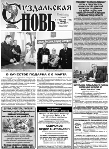 Газета основана 21 марта 1918 г. № 19-20 (11768-11769) пятница, 10 марта 2017 г. Общественнополитическая газета ПРИЕМ ГРАЖДАН ПО ЛИЧНЫМ ВОПРОСАМ В общественной приемной Партии «ЕДИНАЯ РОССИЯ» будет вести прием граждан по личным вопросам с 9.00 до 10.00 часов 15 марта – Юдин Сергей Александрович, член политического совета местного отделения Партии «ЕДИНАЯ РОССИЯ». Адрес: г. Суздаль, ул. Ленина, д. 78 (районная библиотека). *** 15 марта 2017 года с 10.00 до 12.00 в общественной приемной Губернатора Владимирской области по Суздальскому району прием граждан по личным вопросам проводит управляющий государственным учреждением – отделением Пенсионного фонда РФ по Владимирской области Мазанько Александр Алексеевич. Прием будет проводиться в здании администрации Суздальского района (г. Суздаль, Красная площадь, д. 1, каб. № 38, 3 этаж). 7 марта на утреннем оперативном совещании начальник ОМВД России по Суздальскому району подполковник полиции Д.А. Ильин поздравил прекрасную половину коллектива с праздником 8 Марта. Он пожелал сотрудницам успехов в службе, счастья, оптимизма, достатка и семейного благополучия. А ближе к полудню в актовом зале вновь звучали приятные слова в адрес дам. Зам. начальника ОМВД России по Суздальскому району подполковник внутренней службы С.В. Кузнецов торжественно вручил главному редактору районной газеты «Суздальская новь» И.П. Белан Благодарность, подписанную начальником УМВД России по Владимирской области генерал-майором полиции В.П. Кукушкиным. Между суздальскими стражами порядка и журналистами установились тесные деловые контакты. Только за 2016 год в районке было опубликовано более 90 материалов полицейской тематики, с весьма важной для жителей Суздальской земли информацией, неоднократно в течение года выходил тематический вестник ОМВД «Закон и порядок». С.В. Кузнецов высказал уверенность в том, что и в будущем полицейские и журналисты будут плодотворно сотрудничать. Другими виновниками торжества стали четыре юные суздалянки: Любовь Осетрова, Дарья Бычкова, Ирина Плотникова, Анастасия Королёва. Начальник отделения по вопросам миграции ОМВД майор полиции А.В. Савельев и помощник начальника ОМВД-начальник отделения по работе с личным составом подполковник внутренней службы П.Г. Королёв вручили 14-летним девушкам первый в их жизни документ - паспорт гражданина Российской Федерации, который наказали беречь как зеницу ока. Офицеры пожелали им любить свою Родину, быть достойными гражданами России. Ну и, конечно, стражи порядка не забыли про женский праздник 8 Марта. Женщинам были вручены букеты цветов и высказаны приятные пожелания. В. СУХОВ. Фото автора. В КАЧЕСТВЕ ПОДАРКА К 8 МАРТА Паспорт получает Любовь Осетрова. Его вручают А.В. Савельев и П.Г. Королев. Благодарность И.П. Белан вручили С.В. Кузнецов и П.Г. Королев. ООО «Надежда+» Клиника «ТВОЙ ДОКТОР» г.Владимир 18 марта с 9.00 в городе Владимире по адресу: ул. Мира, д. 15 БУДЕТ ВЕСТИ ПРИЁМ ЗАВЕДУЮЩИЙ УРОЛОГИЧЕСКИМ ЦЕНТРОМ, ОДИН ИЗ ВЕДУЩИХ УРОЛОГОВ РОССИИ, ПРОФЕССОР, ДОКТОР МЕДИЦИНСКИХ НАУК СЕВРЮКОВ ФЕДОР АНАТОЛЬЕВИЧ (Все виды урологических заболеваний, в том числе онкологических) СТОИМОСТЬ ПРИЕМА 2000 РУБЛЕЙ. СПРАВКИ И ЗАПИСЬ ПО ТЕЛЕФОНАМ: 47-47-08, 47-47-09, 8-904-259-59-31 Дополнительная информация на сайте: www.tvoi-doctor33.ru ВНИМАНИЕ! ИМЕЮТСЯ ПРОТИВОПОКАЗАНИЯ, ПРОКОНСУЛЬТИРУЙТЕСЬ СО СПЕЦИАЛИСТОМ Лиц. №ЛО-33-01-