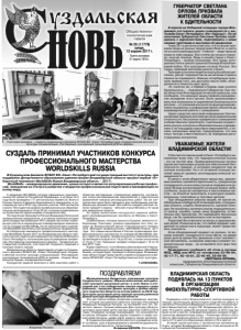 Газета основана 21 марта 1918 г. № 29 (11778) среда, 12 апреля 2017 г. Общественнополитическая газета СУЗДАЛЬ ПРИНИМАЛ УЧАСТНИКОВ КОНКУРСА ПРОФЕССИОНАЛЬНОГО МАСТЕРСТВА WORLDSKILLS RUSSIA К движению WorldSkills сегодня официально присоединились 84 субъекта Российской Федерации, в которых за 4 года были проведены 177 региональных первенств. Всего в России прошли 4 финала Национального чемпионата, в последнем из них в 2016 году приняли участие 1000 экспертов и около 750 студентов средних профессиональных образовательных организаций от 16 до 22 лет, которые соревновались по более чем 50 компетенциям (специальностям). По поручению Президента России Владимира Путина все промышленные предприятия, в уставном капитале которых доля государства превышает 50%, каждый год готовят команды для участия в национальных и международных чемпионатах по стандартам WorldSkills. На сегодняшний день в движение WorldSkills вовлечены 250 промышленных предприятий. В отборочном чемпионате профессионального мастерства WorldSkills Russia-2017 во Владимирской области приняли участие студенты реставрационных отделений Москвы и Санкт-Петербурга, получающие одну из редчайших профессий «Реставратор произведений из дерева». Профессия реставратора особенная, она помогает сохранить традиции и культуру нашего народа. Владимирскую область представляли студенты Суздальского филиала ФГБОУ ВО «Санкт-Петербургский государственный институт культуры специализации «Реставрация, консервация произведений ДПИ из дерева» -Соцков Илья, Шагалов Герман, Альмухаметов Роман. Конкурсное задание включало в себя комплекс работ с объектом реставрации: определение дефектов, составление плана реставрационных мероприятий и практическое применение навыков реставрационных работ. Так же конкурсантам нужно было оформить всю необходимую реставрационную документацию. Для работы каждый участник получил предмет старины – венские стулья XIX века и 15 часов для завершения проекта. За ходом выполнения конкурсного задания наблюдали квалифицированные эксперты из Москвы и СанктПетербурга. Соревнования, которые прошли в Суздале, являются отборочными. Участники, успешно прошедшие этот этап, попадут во Всероссийский финал V Национального чемпионата «Молодые профессионалы» (WorldSkills Russia) 2017 года. Это самые масштабные в России соревнования профессионального мастерства по стандартам WorldSkills среди студентов средних профессиональных образовательных организаций в возрасте от 16 до 22 лет, а также школьников от 10 до 17 лет. Чемпионат пройдет в Краснодаре с 15 по 19 мая 2017 года. Будем надеяться, что во Всероссийском финале V Национального чемпионата «Молодые профессионалы» (WorldSkills Russia), который будет проходить в Краснодаре, Владимирскую область будут представлять студенты Суздальского филиала ФГБОУ ВО «Санкт-Петербургский институт культуры». Г.АЛЕКСЕЕВА. В Суздальском филиале ФГБОУ ВО «Санкт-Петербургский государственный институт культуры» при поддержке Департамента образования администрации Владимирской области прошел первый «Отборочный чемпионат WorldSkills Russia Владимирская область – 2017». WorldSkills – международное движение, целью которого является популяризация рабочих профессий, повышение их статуса и развитие стандартов профессиональной подготовки и квалификации по всему миру. ПОЗДРАВЛЯЕМ! Муниципальное бюджетное учреждение культуры С