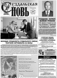 Газета основана 21 марта 1918 г. № 31 (11780) среда, 19 апреля 2017 г. Общественнополитическая газета ГРАЖДАНИН. ПАТРИОТ. ВЕЛИКИЙ ТРУЖЕНИК Именно с именем Анатолия Максимовича Думова, Почетного гражданина города Суздаля, много лет проработавшего председателем исполкома Суздальского городского Совета народных депутатов, связаны самые значимые перемены, которые происходили в жизни Суздаля и суздальцев. Он стоял у истоков возрождения Суздаля как центра мирового туризма. Читайте на 3 стр. ООО «Надежда+» Клиника «ТВОЙ ДОКТОР» г.Владимир 22 апреля 2017 г. с 9.00 в поликлинике на базе Суздальской РБ БУДУТ ВЕСТИ КОНСУЛЬТАТИВНЫЙ ПРИЕМ ВРАЧИ-СПЕЦИАЛИСТЫ ИЗ Г. ВЛАДИМИРА: НАЗАРЕНКО ГАЛИНА ВАСИЛЬЕВНА - врач-эндокринолог высшей квалификационной категории ЗЯБЛИЦЕВ ДМИТРИЙ АНАТОЛЬЕВИЧ - врач-кардиолог высшей квалификационной категории ПЛАТОНОВА НАТАЛЬЯ СЕРГЕЕВНА - врач УЗ-диагностики высшей квалификационной категории (УЗИ органов брюшной полости, простаты, УЗИ щитовидной и молочных желез, УЗИ гинекологическое, УЗИ сердца) ПРИЁМ ПЛАТНЫЙ ПО ПРЕДВАРИТЕЛЬНОЙ ЗАПИСИ ПО ТЕЛЕФОНУ 8 (49231) 2-01-22. ВНИМАНИЕ! ИМЕЮТСЯ ПРОТИВОПОКАЗАНИЯ, ПРОКОНСУЛЬТИРУЙТЕСЬ СО СПЕЦИАЛИСТОМ. Лиц. №ЛО-33-01-001691 от 17.10.2014 выд. деп. здравоохр. адм. Влад. обл. Реклама МОЛОДЫЕ СПЕЦИАЛИСТЫ СУЗДАЛЬСКОГО РАЙОНА ПОЛУЧИЛИ СЕРТИФИКАТЫ НА ЖИЛЬЕ 14 апреля в администрации Суздальского района состоялось вручение свидетельств о предоставлении субсидий на приобретение (строительство) жилья в сельской местности в рамках программы "Устойчивое развитие сельских территорий на 2014-2017 годы и на период до 2020 года". Счастливыми обладателями свидетельств стали 14 молодых семей и молодых специалистов Суздальского района (из 47 участников Владимирской области), которые трудятся в социальной сфере или агропромышленном комплексе в сельской местности. В 2017 году участниками программы впервые стали семьи из всех сельских поселений Суздальского района. Реализация программы является одним из действующих механизмов привлечения молодежи на село. В рамках программы «Устойчивое развитие сельских территорий на 2014-2017 год и на период до 2020 года» граждане, в том числе молодые семьи и молодые специалисты, получают социальные выплаты на приобретение или строительство жилья в размере 70% от расчетной стоимости. С начала реализации программы её участниками стали 32 семьи. Ими приобретено и построено более 2,5 тыс.кв. метров жилья. Общий объем выделенных бюджетных средств за 3 года превысил 33 млн.рублей. Львиную долю составляют средства федерального и областного бюджетов. Главным условием участия в программе является работа одного из членов семьи в агропромышленном комплексе или в социальной сфере Суздальского района. Преимущественное право имеют те молодые семьи и молодые специалисты, которые переехали из других областей и изъявили желание работать в Суздальском районе. Молодые семьи и молодые специалисты, получившие социальные выплаты в рамках программы, приобретают обязанность отработать на предприятии или в учреждении не менее 5 лет с момента выдачи им свидетельств о государственной поддержке. Фото М. Пахомовой. Свидетельства молодым специалистам вручает Глава Суздальского района Алексей Сараев. А.М. Думова в Суздале до сих пор вспоминают с уважением и благодарностью. 19 апреля ему исполнилось бы 90 лет. «ГОРЯЧАЯ ЛИНИЯ» 
