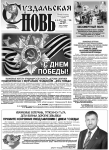 Газета основана 21 марта 1918 г. № 36-37 (11785-11786) пятница, 5 мая 2017 г. Общественнополитическая газета Этот праздник – символ величайшего мужества и самоотверженности нашего народа. Несгибаемая сила духа, верность воинскому долгу, стойкость и героизм защитников Родины достойны самого высокого уважения. Победа в Великой Отечественной войне далась нашим дедам и прадедам неимоверно высокой ценой. Миллионы наших соотечественников пожертвовали жизнью ради свободы и благополучия будущих поколений. В этот особенный майский день мы безмерно благодарны воинам, которые сражались на фронтах Великой Отечественной. Мы гордимся нашими земляками, которые своим доблестным трудом ковали Победу в тылу. Мы помним о непростой судьбе детей войны, которые пережили эти тяжелые годы. На плечах нашего великого народа лежало восстановление городов и сел в послевоенное время. Сегодня мы несем ответственность за судьбу своей малой Родины, за будущее России. Наша задача – сохранить нравственный фундамент, заложенный поколением победителей, воспитывать молодежь на примерах героев Великой Отечественной войны, работать на благо родного края. Вместе мы можем сделать многое! Уважаемые ветераны, дорогие земляки! В этот знаменательный день от всей души желаю вам крепкого здоровья, добра и благополучия! С праздником! С Днем Великой Победы! С уважением, Григорий АНИКЕЕВ, депутат Государственной Думы РФ. духа, лионы ликой омним ежало щее ем ой й ! , УВАЖАЕМЫЕ ВЕТЕРАНЫ, ТРУЖЕНИКИ ТЫЛА, ДЕТИ ВОЙНЫ! ДОРОГИЕ ЗЕМЛЯКИ! ПРИМИТЕ ИСКРЕННИЕ ПОЗДРАВЛЕНИЯ С ДНЕМ ПОБЕДЫ! С ДНЕМ ПОБЕДЫ! УВАЖАЕМЫЕ ЖИТЕЛИ ВЛАДИМИРСКОЙ ОБЛАСТИ, ДОРОГИЕ ЗЕМЛЯКИ! ПОЗДРАВЛЯЕМ ВАС С ВЕЛИЧАЙШИМ ПРАЗДНИКОМ – ДНЁМ ПОБЕДЫ! Это особая дата для всех россиян. Праздник со слезами на глазах… Это день, когда мы вспоминаем о невосполнимых утратах – ни одну нашу семью не обошла беда в эти четыре кровавых года. Это день, когда мы вспоминаем о великом подвиге единого народа, прошедшего через боль, голод, холод, лишения, но отвоевавшего мир, свободу и независимость для себя и своей Родины, освободившего от нацизма Европу. Мы склоняем головы перед теми, кто, не жалея жизни, защищал Отечество на фронте, кто на пределе человеческих возможностей ковал Победу в тылу, кто поднимал и поднял из руин и пепла родные города и сёла, когда война была окончена. Дорогие наши ветераны, участники Великой Отечественной войны, труженики тыла, дети войны, мы гордимся вами и равняемся на ваш пример. Спасибо за то, что вы всегда с нами. Дорогие земляки! Сегодня на нас лежит особая ответственность. С каждым годом всё меньше остаётся свидетелей трудных военных лет... Ветераны уходят, навеки оставаясь солдатами Бессмертного полка… Вечная им память! И уже наша с вами задача – не дать Памяти угаснуть, не позволить переписать, извратить историю Великой Отечественной войны, обесценить те нечеловеческие усилия, которыми далась нашим отцам и дедам Великая Победа! Примите самые искренние пожелания мира, тепла и благополучия! С праздником! С Днём Великой Победы! С.Ю. ОРЛОВА, Губернатор Владимирской области. В.Н. КИСЕЛЁВ, председатель Законодательного Собрания Владимирской области. С.С. МАМЕЕВ, главный федеральный инспектор по Владимирской области. БЕССМЕРТНЫЙ ПОЛК УВАЖАЕМЫЕ ВЕТЕРАНЫ ВЕЛИКОЙ ОТЕЧЕСТВЕННОЙ ВОЙНЫ, ТРУЖЕНИКИ ТЫЛА, ВДОВЫ, МАЛОЛЕТНИЕ УЗНИ