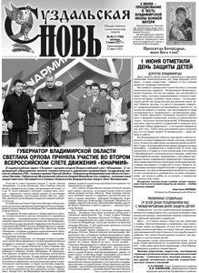 Газета основана 21 марта 1918 г. № 44 (11793) пятница, 2 июня 2017 г. Общественнополитическая газета Участие в слете приняли свыше 2 тысяч членов «Юнармии» со всех регионов. Как отметил Сергей Шойгу, ежемесячно в ряды организации вступает от 5 до 15 тысяч девушек и юношей, главная цель которых – приносить пользу своей стране. В настоящее время «Юнармия» насчитывает более 100 тыс. человек, филиалы организации созданы в каждом субъекте России. В своём выступлении Светлана Орлова поблагодарила за помощь движению Президента России Владимира Путина и министра обороны РФ, генерала армии Сергея Шойгу. «Создание Всероссийского общественного военно-патриотического детско-юношеского движения «Юнармия» - своевременный и обусловленный важнейшей задачей сплочения страны шаг. Во Владимирской области при активной поддержке регионального отделения ДОСААФ России и Владимирского отделения организации «Боевое братство» местные штабы «Юнармии» созданы в каждом муниципальном образовании, а это более 2000 юнармейцев», - подчеркнула Светлана Орлова. Губернатор отметила, что важным этапом в развитии и укреплении движения стал Юнармейский форум Западного военного округа, который прошел в марте 2017 года в городе Воинской Славы Коврове при поддержке Министерства обороны Российской Федерации и Главного штаба «Юнармии». В мероприятии приняли активное участие команды школьников из 26 субъектов России. В ходе работы форума были выработаны предложения в стратегию развития Всероссийского движения, рассмотрены методики патриотического воспитания, а также состоялась уникальная акция - копии Знамени Победы были переданы на вечное хранение во все районные штабы «Юнармии». Кроме того, во Владимире был заложен первый камень на месте строительства областного военно-патриотического парка. «Это новый общественно-патриотический проект для нашего региона, в который может внести свой вклад каждый житель области. Парк призван напомнить великие имена и сохранить историческую память о наших земляках - Дмитрии Пожарском, Александре Невском, Александре Суворове, Михаиле Лазареве, Николае Гастелло, Василии Дегтяреве, дикторе Юрии Левитане и многих других», - сказала Светлана Орлова. Как отметила глава 33-го региона, сегодня юнармейцы - активные участники основных областных и городских мероприятий. Так, 9 мая, в День Победы, большая копия Знамени Великой Победы, пронесенная юнармейцами во главе колонны Бессмертного полка во Владимире, была доставлена на Красную площадь Москвы. С ней делегация прошла в столице в строю Бессмертного полка. В настоящее время совместно с Министерством обороны России, Всероссийской организацией «Боевое братство» и Главным штабом юнармейского движения реализуется еще один международный общественно-патриотический проект - «Молодая Гвардия шагает по стране. Живите за нас!». В его основе – спектакль Владимирского областного академического театра драмы «Молодая гвардия». Эту постановку, посвященную подвигу сражавшихся за независимость нашей Родины молодогвардейцев, увидят по всей стране. Спектакль будут показывать до 2 сентября – дня окончания Второй мировой войны. «У «Юнармии» большие перспективы. Сегодня движение более чем востребовано. Оно принято и поддержано детьми, их родителями, общественными организациями - как актуальная модель 