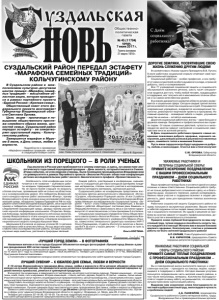 Газета основана 21 марта 1918 г. № 45 (11794) среда, 7 июня 2017 г. Общественнополитическая газета ДОРОГИЕ ЗЕМЛЯКИ, ПОСВЯТИВШИЕ СВОЮ ЖИЗНЬ СЛУЖЕНИЮ ДРУГИМ ЛЮДЯМ! В соответствии с Указом нашего Президента В.В. Путина 8 июня работники социальной отрасли отмечают свой профессиональный праздник. Социальный работник – особая профессия, и она требует от своих служителей особого душевного склада, огромной доброты, такта и сопереживания. Все 77 учреждений социальной защиты и социального обслуживания населения региона, шесть тысяч специалистов трудятся для того, чтобы любой человек, нуждающийся в поддержке, мог получить её в максимально полном объеме и на самом качественном уровне. В условиях динамичного развития области активно развивается и социальная сфера. Сегодня каждый третий житель региона является клиентом социальных служб. Открываются современные учреждения, внедряются инновационные технологии, реализуются творческие проекты и программы. Но главный ориентир – всемерная забота о людях, улучшение качества их жизни – остаётся неизменным. Дорогие социальные работники, все вы – одна большая и дружная команда. Ежедневно и профессионально вы служите людям. От ваших слаженных действий, чуткости и милосердия во многом зависит настроение и социальное самочувствие многих жителей региона. В День социального работника примите самые искренние пожелания доброго здоровья, хорошего настроения, дальнейших успехов в решении поставленных задач, семейного тепла и внимания близких. Пусть ваши сердца всегда будут щедрыми на доброту, любовь и милосердие. Счастья вам и благополучия! С.Ю. ОРЛОВА, Губернатор Владимирской области. УВАЖАЕМЫЕ РАБОТНИКИ И ВЕТЕРАНЫ СОЦИАЛЬНОЙ СФЕРЫ! ПРИМИТЕ ИСКРЕННИЕ ПОЗДРАВЛЕНИЯ С ВАШИМ ПРОФЕССИОНАЛЬНЫМ ПРАЗДНИКОМ – ДНЕМ СОЦИАЛЬНОГО РАБОТНИКА! Ваша профессия всегда была и остается одной из самых сложных и самых ответственных. Социальная работа требует не только добросовестного отношения к делу, но и благородства души, огромного терпения, умения сопереживать. Именно ваше участие и поддержка вселяют в людей уверенность, дают силы для преодоления тяжелых жизненных испытаний. Работники социальной защиты Суздальского района по праву пользуются заслуженным уважением. Вашим теплом и заботой окружены сотни людей самых различных возрастов и социального положения. Их судьба и решение их проблем во многом зависят от вашего профессионализма, доброго участия и внимательного отношения. Примите слова глубокой благодарности за ваш неустанный труд, чуткие сердца и способность согреть тех, кто нуждается в помощи! Желаем вам и вашим близким крепкого здоровья, благополучия, счастья и успешной работы на благо жителей Суздальского района! А.П.САРАЕВ, Глава Суздальского района. В.В. КИРИЛЛОВ, председатель Совета народных депутатов Суздальского района. УВАЖАЕМЫЕ РАБОТНИКИ СОЦИАЛЬНОЙ СФЕРЫ СУЗДАЛЬСКОГО РАЙОНА! ПРИМИТЕ САМЫЕ ТЕПЛЫЕ ПОЗДРАВЛЕНИЯ С ПРОФЕССИОНАЛЬНЫМ ПРАЗДНИКОМ – ДНЕМ СОЦИАЛЬНОГО РАБОТНИКА! Вы в повседневной жизни выполняете важную и ответственную миссию – приходите на помощь людям, нуждающимся в поддержке и заботе. Сегодня вашими услугами пользуется определенная часть жителей нашего района, в том числе пенсионеры, ветераны. Количество благодарностей от людей за вашу заботу не уменьшается, что является лучшим 