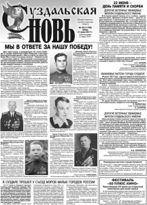 Газета основана 21 марта 1918 г. № 49 (11798) среда, 21 июня 2017 г. Общественнополитическая газета ДОРОГИЕ ВЕТЕРАНЫ! УВАЖАЕМЫЕ ЖИТЕЛИ СУЗДАЛЬСКОГО РАЙОНА! Наша великая страна отмечает одну из самых печальных и трагических дат в истории нашего общества – день начала Великой Отечественной войны. Сегодня мы отчетливо понимаем, что все наши успехи и достижения являются результатом Победы, завоеванной мужеством, воинской доблестью и великим трудовым подвигом Советского народа. В те грозные годы вместе со всей страной на защиту Родины встали и наши земляки – суздальцы. Мы скорбим по всем, кто ценой своей жизни выполнил святой долг, защитил свою Родину, отстоял свободу и независимость нашего отечества. Низкий поклон всем, кто героически воевал на фронте и не жалея сил работал в тылу, приближая великую Победу. От имени районного Совета ветеранов желаю нашим дорогим ветеранам, всем жителям Суздальского района крепкого здоровья, заботы и внимания родных и близких. А.Б. ПАНФИЛОВ, председатель Суздальского районного Совета ветеранов войны, труда, Вооруженных Сил и правоохранительных органов, Почетный гражданин Суздальского района. Уважаемые жители города Суздаля! 22 июня 2017 года приглашаем принять участие в акции "Свеча скорби", посвященной Дню памяти и скорби. Сбор участников акции в 20.30 у Центра культуры и досуга города Суздаля. Начало движения колонны в 21.00. У Вечного огня состоится традиционный митинг. УВАЖАЕМЫЕ ЖИТЕЛИ ГОРОДА СУЗДАЛЯ! 22 июня 1941 года - одна из самых печальных дат в нашей истории, начало Великой Отечественной войны. Этот день напоминает нам о всех погибших, замученных в фашистской неволе, умерших в тылу от голода и лишений. Война… вслушайтесь в это страшное слово, в нём эхо взрывов, гул вражеских самолётов, стоны раненых, слёзы матерей, потерявших самое дорогое, что у них есть. Сегодня мы скорбим обо всех павших в то страшное время, обо всех, кто вынес на своих плечах победу, но умер от ран и болезней спустя годы. Именно в День памяти и скорби мы, россияне, осознаём, что когда-то вся страна сплотилась воедино для борьбы с общим врагом. От души желаем дорогим ветеранам долгой и счастливой жизни, бодрости и оптимизма. Л. МАЙОРОВА, глава города Суздаля. С. САХАРОВ, глава администрации города Суздаля. ФЕСТИВАЛЬ «50 ПЛЮС.КИНО» Приглашаем 23 июня на открытый кинопоказ для всей семьи В программе фестиваля творческая встреча с народной артисткой РСФСР Ларисой Лужиной и заслуженной артисткой России Жанной Эппле в 17.00. Художественный фильм «Самая обаятельная и привлекательная» в 20.30. Адрес: г. Суздаль, ГК «Пушкарская слобода», улица Ленина, 45. ВХОД СВОБОДНЫЙ. Два года назад, в преддверии 70-летия Победы в городе воинской славы Коврове стартовал патриотический проект «Мы в ответе за нашу Победу! Мы в ответе за нашу страну!». Главное в нем – поисковая работа. Школьникам и молодежи не хватает знаний истории, именно поэтому так важна организация военно-патриотической работы среди подрастающего поколения. Нынешняя молодежь, к сожалению, мало знает историю своей Родины, в том числе историю Великой Отечественной войны. В современных учебниках истории той героической поре отводится буквально полторы страницы текста. Проект «Мы в ответе за нашу Победу! Мы в ответе за нашу страну!» как раз и нацелен на то, чтобы удалить этот пробел. Только за год удалось уст