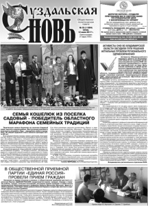 Газета основана 21 марта 1918 г. № 55 (11804) среда, 12 июля 2017 г. Общественнополитическая газета Бронирование по тел. 8-920-922-40-69 или на сайте www.svbani.ru ДОРОГИЕ ЖИТЕЛИ г.СУЗДАЛЯ! ПРИГЛАШАЕМ ВАС В СВЕТЛУЮ БАНЮ ПО СПЕЦИАЛЬНОЙ ЦЕНЕ С ВОСКРЕСЕНЬЯ ПО ЧЕТВЕРГ Для вас индивидуальные залы, дровяные печи, контрастные купели, комната отдыха, ароматный чай. Принимаются группы от 4 до 8 человек. СТОИМОСТЬ ПОСЕЩЕНИЯ: 400 рублей с человека за 3 часа, ДЕТИ до 7 лет – БЕСПЛАТНО Во время визита предлагаем пройти медово-соляной пилинг всего тела - 500 рублей с человека Реклама Творческую семью Кошелюк из поселка Садовый знают многие в нашем районе. Выступления семейного вокального ансамбля «Лад» - украшение любого праздника. Их общий трудовой стаж в области культуры почти 60 лет. В их копилке немало наград: грамот, дипломов, благодарностей. В 2015 году семья была награждена памятной медалью «За любовь и верность». А 8 июля этого года диплом победителя областного марафона семейных традиций в Муроме на праздновании Всероссийского дня семьи, любви и верности Кошелюкам вручили Губернатор области Светлана Орлова и полномочный представитель Президента России в Центральном Федеральном округе Александр Беглов. Эта крепкая дружная семья работает в Доме культуры поселка Садовый. Их девиз - «С песней по жизни!». Это большая редкость, когда всей семьей на работе и дома вместе. Супруги Татьяна и Владимир не только сами посвятили свою жизнь музыке, песне, но и привили любовь к русской песенной культуре, обрядовым традициям нашего народа своим детям. Татьяна Кошелюк с 2014 года работает директором Дома культуры, глава семьи – основатель и руководитель эстрадной студии, которой в прошлом году исполнилось 22 года. Сын Илья руководит детским коллективом «Ярило» и мужским вокальным ансамблем «Мономах». Молодой человек очень талантлив, владеет несколькими музыкальными инструментами – саксофоном, фортепиано, гитарой, балалайкой, жалейкой. Не раз он был победителем районных и областных вокальных конкурсов. Илья проходил срочную службу в образцово-показательном оркестре внутренних войск МВД России (г. Москва). Младшая дочь Анна окончила Садовую среднюю школу с золотой медалью, и Владимирский государственный университет с красным дипломом. Темой дипломного проекта являлось обоснование проведения Праздника клубники в п. Садовый. Этот проект был успешно представлен на III Всероссийской ярмарке событийного туризма и отмечен дипломом за инновационный подход к развитию событийного туризма в регионе. Анна работает режиссером массовых представлений. В 2008 году Кошелюки основали вокальный ансамбль «Лад». Это не просто творческий союз, это союз единомышленников, сподвижников в большом и важном деле сохранения культурных традиций русского народа. Галина ФИРСОВА.Фото Владимира Едунова. СЕМЬЯ КОШЕЛЮК ИЗ ПОСЕЛКА САДОВЫЙ - ПОБЕДИТЕЛЬ ОБЛАСТНОГО МАРАФОНА СЕМЕЙНЫХ ТРАДИЦИЙ В ОБЩЕСТВЕННОЙ ПРИЕМНОЙ ПАРТИИ «ЕДИНАЯ РОССИЯ» ПРОВЕЛИ ПРИЕМ ГРАЖДАН Несмотря на время отпусков и каникул, в общественной приемной местного отделения Партии «ЕДИНАЯ РОССИЯ» продолжается прием граждан. Наряду с главами района, города, сельских поселений, регулярно прием проводит и заместитель председателя Законодательного Собрания области Вячеслав Картухин. Вместе с ними в приеме участвуют Глава района Алексей Сараев 