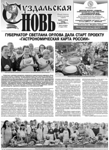 Газета основана 21 марта 1918 г. № 63 (11812) среда, 9 августа 2017 г. Общественнополитическая газета Светлана Орлова отметила, что регионы, объединившись на «Гастрономической карте России», способны удивить своих гостей самобытным туристическим продуктом, кулинарными традициями нашей многонациональной страны, которые необходимо продвигать за рубежом, создавая новую историю в поварском и кулинарном искусстве. Продвижение национальной кухни – не только неотъемлемая часть программы развития въездного и внутреннего туризма, но и инструмент продвижения продуктов российского производства. «На древней Владимирской земле, славной своими красотами, тысячелетним историческим наследием и развивающей новые туристические маршруты, стартует проект Федерального агентства по туризму «Гастрономическая карта России». Именно во Владимирской области была разработана первая в России технология создания и продвижения региональных гастрономических брендов и национальной кухни. И сегодня мы ещё раз убеждаемся в том, что Суздаль по праву заслуживает всемирной известности», – подчеркнула Светлана Орлова. На живописном берегу реки Каменка у древних стен Спасо-Евфимиева монастыря с панорамным видом на Покровский монастырь, где 50 лет назад выдающийся журналист Василий Бычков придумал название ныне всемирно известному маршруту «Золотое кольцо России», для участников и гостей праздника был накрыт «Народный стол», на котором были представлены продукты местного производства и блюда региональной кухни. Их «авторов» – фермеров, поваров и рестораторов Владимирской области – представил заместитель Губернатора Михаил Колков: «Главным богатством нашей земли являются люди. И для гастрономии это не исключение, а безусловное правило. И сейчас за этим столом собрались люди, которые делают жизнь в нашей стране вкусной». Михаил Колков провёл презентацию угощений, украсивших праздничный стол. Для гостей была организована их дегустация. Особенное впечатление на присутствующих ГУБЕРНАТОР СВЕТЛАНА ОРЛОВА ДАЛА СТАРТ ПРОЕКТУ «ГАСТРОНОМИЧЕСКАЯ КАРТА РОССИИ» 3 августа от «нулевого километра» знаменитого туристического маршрута «Золотое кольцо России» в Суздале был дан официальный старт проекту Ростуризма «Гастрономическая карта России». В мероприятии приняли участие Губернатор Владимирской области Светлана Орлова, её заместитель Михаил Колков, руководители структурных подразделений областной администрации, заместитель председателя Законодательного Собрания Ольга Хохлова, и.о. Главы Суздальского района Татьяна Срибная, глава администрации города Суздаля Сергей Сахаров, представители Ростуризма, руководитель проекта «АгроЭкоТуризм России» Екатерина Шаповалова, ресторатор Игорь Кехтер, рестораторы, отельеры, шеф-повары, фермеры, производители продуктов, журналисты федеральных и региональных СМИ. произвели царский курник, сыры из оленьего молока, огуречное мороженое и варенье. Для всех желающих мастера суздальской кухни провели мастер-класс по приготовлению гречневого попкорна. В рамках церемонии был дан старт первой экспедиции «Гастрономической карты России» на автомобилях «УАЗ-Патриот» и «УАЗ-Пикап», которые отправились из Суздаля по маршруту экспедиции «Владимир – Казань – Ижевск – Самара – Москва». В торжественной обстановке Гу