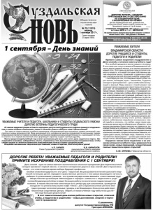 Газета основана 21 марта 1918 г. № 70 (11819) пятница, 1 сентября 2017 г. Общественнополитическая газета День знаний - один из самых важных и волнительных школьных праздников! Для первоклассников сегодня прозвенит первый звонок, и начнется интересная дорога в мир знаний. Для старшеклассников - это ответственное время выбора будущей профессии. Особые слова благодарности в этот день - педагогам. Вы раскрываете интеллектуальный и творческий потенциал детей, передаете нравственные ценности и тем самым формируете личность ребенка. И успехи ваших учеников - это лучшая награда за ваш важный и ответственный труд! Общественная организация «Милосердие и порядок» совместно с педагогами и родителями Владимирской области ведет большую работу по воспитанию подрастающего поколения. В нашем бесплатном кинотеатре есть репертуар для школьников, проводятся экскурсии по уникальному музею-кафе «Гжель», для старшеклассников региона ежегодно проходят интеллектуальные турниры, а во Владимире и Кольчугине действуют бесплатные спортивные центры. Уверен, в новом учебном году вместе мы достигнем еще больших результатов! В этот замечательный день желаю ребятам новых открытий, отличной учебы, а педагогам и родителям – новых достижений, энергии и терпения! С праздником! С уважением, депутат Государственной Думы РФ Григорий АНИКЕЕВ. ссников еклассй и творичность й труд! диося ет - День знаний сегодня прозве ников - это от Особые сл ческий поте ребенка. И Общес телями Вл коления. экскурс годно беспл не уч н ДОРОГИЕ РЕБЯТА! УВАЖАЕМЫЕ ПЕДАГОГИ И РОДИТЕЛИ! ПРИМИТЕ ИСКРЕННИЕ ПОЗДРАВЛЕНИЯ С 1 СЕНТЯБРЯ! Бронирование по тел. 8-920-922-40-69 или на сайте www.svbani.ru ДОРОГИЕ ЖИТЕЛИ г.СУЗДАЛЯ! ПРИГЛАШАЕМ ВАС В СВЕТЛУЮ БАНЮ ПО СПЕЦИАЛЬНОЙ ЦЕНЕ С ВОСКРЕСЕНЬЯ ПО ЧЕТВЕРГ Для вас индивидуальные залы, дровяные печи, контрастные купели, комната отдыха, ароматный чай. Принимаются группы от 4 до 8 человек. СТОИМОСТЬ ПОСЕЩЕНИЯ: 400 рублей с человека за 3 часа, ДЕТИ до 7 лет – БЕСПЛАТНО Во время визита предлагаем пройти медово-соляной пилинг всего тела - 500 рублей с человека Реклама УВАЖАЕМЫЕ ЖИТЕЛИ ВЛАДИМИРСКОЙ ОБЛАСТИ! ДОРОГИЕ УЧАЩИЕСЯ И СТУДЕНТЫ, ПЕДАГОГИ И РОДИТЕЛИ! Примите самые искренние поздравления с Днем знаний, с началом нового учебного года! Это особый праздник в жизни каждого человека. В этот день для тысяч учащихся Владимирской области звучит первый звонок, в их жизни начинается новый этап. Этот день на долгие годы остался в памяти у каждого, кто ведёт сегодня собственных детей и внуков в школу, провожает студентов в среднее специальное или высшее учебное заведение. 1 сентября для тех, кто впервые переступает порог школы, колледжа, вуза – школьника, студента, молодого преподавателя – день необычайно волнующий и важный. Ведь именно в такой момент нас посещает яркое ощущение ответственности за каждый шаг по направлению к будущему, радость от предстоящих перемен к лучшему, от ожидания новых встреч, открытий и побед. Для старшеклассников и выпускников наступающий учебный год станет определяющим в выборе профессии. А для педагогов сегодняшний праздник – одновременно и дань уважения их самоотверженному труду, и очередной шаг к совершенствованию профессионального мастерства, шаг на возвышенном наставническом пути, не имеющем остановок. Дорогие учащиеся и студенты! Сегодня на вас обращ