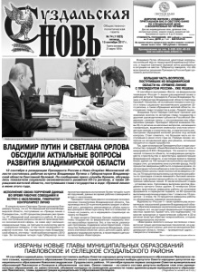Газета основана 21 марта 1918 г. № 74 (11823) пятница, 15 сентября 2017 г. Общественнополитическая газета Бронирование по тел. 8-920-922-40-69 или на сайте www.svbani.ru ДОРОГИЕ ЖИТЕЛИ г.СУЗДАЛЯ! ПРИГЛАШАЕМ ВАС В СВЕТЛУЮ БАНЮ ПО СПЕЦИАЛЬНОЙ ЦЕНЕ С ВОСКРЕСЕНЬЯ ПО ЧЕТВЕРГ Для вас индивидуальные залы, дровяные печи, контрастные купели, комната отдыха, ароматный чай. Принимаются группы от 4 до 8 человек. СТОИМОСТЬ ПОСЕЩЕНИЯ: 400 рублей с человека за 3 часа, ДЕТИ до 7 лет – БЕСПЛАТНО Во время визита предлагаем пройти медово-соляной пилинг всего тела - 500 рублей с человека Реклама ИСПОЛНЕНИЕ СВОИХ ПОРУЧЕНИЙ ДАННЫХ ВО ВРЕМЯ РАБОЧИХ СОВЕЩАНИЙ И ВСТРЕЧ С НАСЕЛЕНИЕМ, ГУБЕРНАТОР КОНТРОЛИРУЕТ ЛИЧНО В начале встречи Светлана Орлова доложила Владимиру Путину, что из 70 обращений жителей Владимирской области, поступивших на «Прямую линию с Президентом», по 63 процентам решения уже приняты, 27 обращений ещё находятся в работе. В основном, поступившие вопросы касаются производственно-экономической сферы, за ними идут жилищнокоммунальные темы, на третьем по количеству месте – социальные вопросы, в том числе касающиеся тарифной политики. Как подчеркнула глава Владимирской области, эти темы – на её особом контроле с 2013 года. За последние четыре года Губернатор лично проконтролировала исполнение более четырёх тысяч её поручений, данных во время рабочих совещаний и встреч с населением. Президент поинтересовался основными экономическими показателями Владимирской области. Так, производство в 33-м регионе демонстрирует стабильный рост, динамично увеличивается объём налоговых доходов в областную казну. Всё это позволяет не только не снижать, но и наращивать социальную нагрузку на бюджет. В ходе встречи Светлана Орлова поблагодарила главу государства за федеральную поддержку многих масштабных проектов. Это, в том числе, реализация программы поддержки монотерриторий, строительство Лыбедской магистрали во Владимире, социально значимых объектов: школ, детских садов, фельдшерско-акушерских пунктов, а также первого детского технопарка «Кванториум». ВЛАДИМИР ПУТИН И СВЕТЛАНА ОРЛОВА ОБСУДИЛИ АКТУАЛЬНЫЕ ВОПРОСЫ РАЗВИТИЯ ВЛАДИМИРСКОЙ ОБЛАСТИ 12 сентября в резиденции Президента России в Ново-Огарёво Московской области состоялась рабочая встреча Владимира Путина с Губернатором Владимирской области Светланой Орловой. По сообщению пресс-службы Кремля, обсуждались показатели социально-экономического развития 33-го региона, а также обращения жителей области, поступившие главе государства в ходе «Прямой линии» в июне этого года. Владимир Путин обозначил некоторые вопросы, поступившие ему из территорий Владимирской области, и поручил Светлане Орловой лично разобраться в ситуациях на местах. Губернатор заверила, что обо всех принятых решениях Президенту России будет доложено дополнительно. БОЛЬШАЯ ЧАСТЬ ВОПРОСОВ, ПОСТУПИВШИХ ИЗ ВЛАДИМИРСКОЙ ОБЛАСТИ НА «ПРЯМУЮ ЛИНИЮ С ПРЕЗИДЕНТОМ РОССИИ», УЖЕ РЕШЕНА 12 сентября в программе «Вести» на федеральном телеканале «Россия-1» вышел расширенный сюжет о рабочей встрече Президента России Владимира Путина и Губернатора Владимирской области Светланы Орловой. Напомним, её основными темами стали итоги и планы социально-экономического развития 33го региона, а также обращения жителей области, поступившие главе государства в ходе «Прямой ли