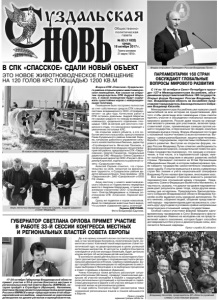 Газета основана 21 марта 1918 г. № 83 (11832) среда, 18 октября 2017 г. Общественнополитическая газета ПАРЛАМЕНТАРИИ 160 СТРАН ОБСУЖДАЮТ ГЛОБАЛЬНЫЕ ВОПРОСЫ МИРОВОГО РАЗВИТИЯ С 14 по 18 октября в Санкт-Петербурге проходит 137-я Межпарламентская Ассамблея, объединившая представителей более 160 государств. Открыл форум Президент России Владимир Путин. Владимирскую область на Ассамблее представляет председатель Законодательного Собрания Владимир Киселёв. Межпарламентскую Ассамблею уже назвали самой масштабной за всю историю ее существования. Для того чтобы делегации всех заявленных стран смогли принять участие в обсуждении глобальных вопросов мирового развития, Россия даже пошла на упрощение визового режима для участников, включая представителей стран, применяющих санкции против нашего государства, и персонально тех людей, кому был запрещен въезд в страну. Форум объединил почти две с половиной тысячи человек со всех континентов. Вопросы - самые разнообразные: защита прав человека, борьба с терроризмом, перспективы глобального мирового развития. Выступая на открытии форума, лидер России Владимир Путин отметил необходимость формирования мирной, созидательной повестки дня. Глава государства подчеркнул, что санкции и ограничения, в том числе, и в парламентской сфере, имеют пагубные последствия и мешают развитию любой страны. Президент сослался на Устав Организации Объединённых Наций, в котором зафиксировано право каждого государства самостоятельно определять свою судьбу. Попытки вмешаться в жизнь суверенных стран без знания и учёта национальной специфики Владимир Путин назвал факторами, вносящими хаос. Все выступающие отмечали важность развития парламентских отношений между странами. Председатель Совета Федерации Валентина Матвиенко, в частности, сказала, что диалог на уровне парламентариев дает результаты даже тогда, когда другие механизмы уже исчерпаны. Председатель Законодательного Собрания Владимирской области Владимир Киселёв особо выделил роль народной дипломатии. По его мнению, общение людей, общение представителей народа - парламентариев дает возможность слышать друг друга даже в условиях крайне напряженных политических отношений между государствами. Особый смысл участники форума придали одновременному проведению в Сочи Всемирного фестиваля молодежи. Именно на молодежь как на представителей нового поколения, которое будет способно договариваться без угроз и демонстрации силы, возлагаются большие надежды. Пресс-служба ЗС области. Вчера в СПК «Спасское» Суздальского района открыли новое животноводческое помещение. Как сказал на открытии председатель СПК Андрей Шарагин, в новом помещении будут содержать сухостойных коров с новорожденными телятами. Помещение было построено полностью за счет собственных средств СПК специалистами владимирского ООО «Строймаркетинг» за два года. Качеством работ в СПК остались довольны. Андрей Шарагин не скрывал радости по поводу возведения новенького «родильного отделения» площадью 1200 кв.метров для местного племенного стада, что несомненно приведет к увеличению поголовья КРС. На открытии нового объекта, а это событие местного масштаба, присутствовали Глава Суздальского района Алексей Сараев, начальник районного управления сельского хозяйства Наталья Лексина, директор