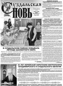 Газета основана 21 марта 1918 г. № 85 (11834) среда, 25 октября 2017 г. Общественнополитическая газета ВНИМАНИЮ СУБЪЕКТОВ ПРЕДПРИНИМАТЕЛЬСКОЙ ДЕЯТЕЛЬНОСТИ! Суздальской межрайонной прокуратурой проводится «горячая линия» по вопросам защиты прав субъектов предпринимательской деятельности. Информацию о нарушенных правах предпринимателей можно сообщить в период с 25.10.2017 по 25.11.2017 по телефону 2-19-65 (помощник прокурора Цымзина Юлия Александровна), 2-07-35 (приемная). ВЫЕЗДНОЙ ПРИЕМ ГРАЖДАН Суздальским межрайонным прокурором Черновым Андреем Александровичем проводится выездной прием граждан на территории муниципальных образований Боголюбовское и Павловское сельских поселений. Прием будет проводиться 31.10.2017 с 10.00 до 11.00 в помещении Сокольской библиотеки, расположенном по адресу: п. Сокол, д. 2, кв. 5. С 11.30 до 12.30 в административном здании ОАО «Племзавод «Порецкое», расположенном по адресу: с. Порецкое, ул. Преображенская, д. 83. Возможна предварительная запись на прием по телефонам 2-07-35, 2-18-55. 20 октября в п. Красногвардейский, известном своими шахматными традициями, состоялась встреча воспитанников МБО ДО «ДЮСШ Суздальского района» с чемпионкой Мира по шахматам Ноной Гаприндашвили. В рамках этой встречи Нона Терентьевна провела сеанс одновременной игры с 20-ю юными шахматистами. Легендарная шахматистка подробно рассказала ребятам о своей спортивной карьере. В 1962 году в возрасте 15 лет Нона стала чемпионкой мира, обыграв в матче на первенстве Мира нашу землячку Елизавету Быкову. Это почетное звание она носила до 1978 года, уступив шахматную корону Майе Чибурданидзе. На шахматном празднике присутствовали Белавенец Людмила Сергеевна, чемпионка Советского Союза ЗМС по шахматам, Струлицкая Галина Николаевна, чемпионка Мира и Европы среди ветеранов, Солонец Сергей Борисович, президент федерации шахмат и шашек Владимирской области. Встреча с легендарными спортсменами произвела на ребят очень большое впечатление и вызвала множество положительных эмоций, что несомненно будет способствовать их дальнейшему занятию шахматами. Н.В. АЛЕКСЕЕВА. Фото автора. Именно так называют чемпионку мира по шахматам Нону Гаприндашвили. В СУЗДАЛЬСКОМ РАЙОНЕ ПОБЫВАЛА ЛЕГЕНДА ШАХМАТНОГО МИРА Нона Гаприндашвили проводит сеанс одновременной игры с юными шахматистами из п. Красногвардейский. Накануне юбилейного дня, 17 октября владыка Евлогий совершил в сослужении митрополита Истринского Арсения, епископов Дмитровского Феофилакта и Воскресенского Саввы всенощное бдение в Богоявленском кафедральном соборе в Елохове. 18 октября митрополит Владимирский и Суздальский Евлогий в сослужении епископов и московского духовенства совершил в Елоховском соборе Божественную литургию и чин молебного пения. Пел хор Богоявленского собора под управлением регента Александра Майорова. По окончании богослужения владыка Истринский Арсений поздравил митрополита Евлогия с 50-летием его иерейской хиротонии, от клира и прихожан Богоявленского собора владыке Евлогию были преподнесены цветы. За праздничной литургией молилась и настоятельница Суздальского Свято-Покровского женского монастыря игумения Екатерина (Кожевникова). Она также выразила сердечную благодарность митрополиту Евлогию за его архипастырское служение на Владимирской земле и преподнесла цветы от сестер обители. 50 Л