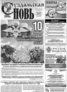 Газета основана 21 марта 1918 г. № 90 (11839) пятница, 10 ноября 2017 г. Общественнополитическая газета Бронирование по тел. 8-920-922-40-69 или на сайте www.svbani.ru ДОРОГИЕ ЖИТЕЛИ г.СУЗДАЛЯ! ПРИГЛАШАЕМ ВАС В СВЕТЛУЮ БАНЮ ПО СПЕЦИАЛЬНОЙ ЦЕНЕ С ВОСКРЕСЕНЬЯ ПО ЧЕТВЕРГ Для вас индивидуальные залы, дровяные печи, контрастные купели, комната отдыха, ароматный чай. Принимаются группы от 4 до 8 человек. СТОИМОСТЬ ПОСЕЩЕНИЯ: 400 рублей с человека за 3 часа, ДЕТИ до 7 лет – БЕСПЛАТНО Во время визита предлагаем пройти медово-соляной пилинг всего тела - 500 рублей с человека Реклама Банкет от 1500 руб./чел. Пробковый сбор отсутствует. Шикарное меню, уютные залы! Приходите к нам в гости. Будем рады вас видеть. Приглашаем вас на новогодние корпоративы в ресторан «Русское подворье»! Суздаль, ул. Пушкарская, 27а. 8(49231) 206-26, 8(904) 599-25-52 suzdal@russkoepodvorie.com www.rp-suzdal.ru Реклама Реклама Реклама Телефоны рекламной службы газеты «Суздальская новь» 8 (49231) 2-01-39, 2-08-95 ООО «Надежда+» Клиника «ТВОЙ ДОКТОР» г.Владимир 18 ноября 2017 г. с 9.00 в поликлинике на базе Суздальской РБ БУДУТ ВЕСТИ КОНСУЛЬТАТИВНЫЙ ПРИЕМ ВРАЧИ-СПЕЦИАЛИСТЫ ИЗ г. ВЛАДИМИРА: ФЕДИН ОЛЕГ ВЯЧЕСЛАВОВИЧврач-уролог высшей квалификационной категории; НАЗАРЕНКО ГАЛИНА ВАСИЛЬЕВНАврач-эндокринолог высшей квалификационной категории; ЗЯБЛИЦЕВ ДМИТРИЙ АНАТОЛЬЕВИЧврач-кардиолог высшей квалификационной категории; ПЛАТОНОВА НАТАЛЬЯ СЕРГЕЕВНА - врач УЗ-диагностики высшей квалификационной категории (УЗИ органов брюшной полости, простаты, УЗИ щитовидной и молочных желез, УЗИ гинекологическое, УЗИ сердца). ПРИЁМ ПЛАТНЫЙ ПО ПРЕДВАРИТЕЛЬНОЙ ЗАПИСИ ПО ТЕЛЕФОНУ 8 (49231) 2-01-22. ВНИМАНИЕ! ИМЕЮТСЯ ПРОТИВОПОКАЗАНИЯ, ПРОКОНСУЛЬТИРУЙТЕСЬ СО СПЕЦИАЛИСТОМ. Лиц. №ЛО-33-01-001691 от 17.10.2014 выд. деп. здравоохр. адм. Влад. обл. Реклама 8 ноября в Суздале состоялось областное торжественное собрание, посвященное Дню работника сельского хозяйства и перерабатывающей промышленности. Аграриев 33-го региона поздравили Губернатор Светлана Орлова, её заместитель Александр Трутнев, председатель Законодательного Собрания Владимир Киселёв и его заместитель Ольга Хохлова, главный федеральный инспектор Сергей Мамеев, депутат Государственной Думы Геннадий Кулик, первый заместитель генерального директора АО «Росагролизинг» Людмила Приданова. В мероприятии также приняли участие первый вице-губернатор Лидия Смолина, заместители главы Владимирской области Александр Лобаков, Сергей Невзоров и Ренат Чагаев. Подробности читайте в следующем выпуске газеты. В СУЗДАЛЕ ОТМЕТИЛИ ДЕНЬ РАБОТНИКА СЕЛЬСКОГО ХОЗЯЙСТВА И ПОДВЕЛИ СЕЛЬСКОХОЗЯЙСТВЕННЫЕ ИТОГИ 2017 ГОДА УВАЖАЕМЫЕ СОТРУДНИКИ И ВЕТЕРАНЫ ОРГАНОВ ВНУТРЕННИХ ДЕЛ! От души поздравляю вас с профессиональным праздником! Ваша самоотверженная служба — залог общественной стабильности и устойчивого развития страны, гарантия безопасности и покоя жителей. Во Владимирском управлении Министерства внутренних дел России служат настоящие профессионалы, для которых долг, честь, достоинство и справедливость - не просто красивые слова, а кредо всей жизни. За многие годы работы вами спасены сотни человеческих жизней, раскрыты сотни тысяч преступлений, ликвидированы тысячи криминальных групп. Ваша работа связана с ежедневным риском, она требует мужества и стойкости, выдержки и полной самоотдачи. Это трудная, но в то же время очень почетная миссия, к