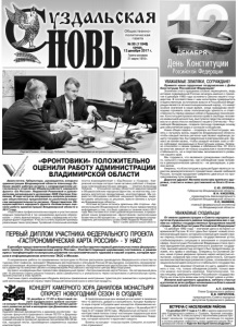 Газета основана 21 марта 1918 г. № 99 (11848) среда, 13 декабря 2017 г. Общественнополитическая газета Заместитель Губернатора, руководитель аппарата администрации Владимирской области Александр Лобаков провёл рабочую встречу с сопредседателем регионального отделения Общероссийского народного фронта «За Россию» Людмилой Романовой и руководителем регионального исполкома ОНФ Сергеем Сливиным. В ходе встречи обсуждались вопросы реализации общественных предложений по различным вопросам жизнедеятельности региона. Представители Общероссийского народного фронта положительно оценили работу администрации Владимирской области в 2017 году. «Подготовка профессиональных кадров и участие наших ведущих предприятий в так называемом дуальном образовании — очень важный вопрос, и очень справедливо его Народный фронт поднимал. У нас есть очень хорошие примеры реализации таких программ: Гусевский стекольный колледж плотно взаимодействует с «БауТексом» и «Гусаром». Ковровский колледж сегодня также активно работает с Ковровским электромеханическим заводом, — отметил Александр Лобаков. — Отношения между областной администрацией и Общероссийским народным фронтом, на мой взгляд, сложились достаточно продуктивные, конструктивные. Мы совместно обсуждаем наиболее насущные проблемы, вырабатываем механизмы их решения, вместе меняем к лучшему Владимирскую область». Итогами встречи остались довольны обе стороны. «Администрацией Владимирской области была предоставлена информация о том, что было сделано в течение всего 2017 года. Мы считаем этот ответ удовлетворительным, а предложения наших владимирских «фронтовиков» выполненными более чем на 90 процентов», — прокомментировала сопредседатель регионального штаба ОНФ Людмила Романова. Пресс-служба администрации области. «ФРОНТОВИКИ» ПОЛОЖИТЕЛЬНО ОЦЕНИЛИ РАБОТУ АДМИНИСТРАЦИИ ВЛАДИМИРСКОЙ ОБЛАСТИ УВАЖАЕМЫЕ ЗЕМЛЯКИ, СОГРАЖДАНЕ! Примите наши сердечные поздравления c Днём Конституции Российской Федерации! Значение этого праздника сложно переоценить, ведь история современной России началась именно с принятия в декабре 1993 года основного Закона нашего государства. В соответствии с ним носителем суверенитета и единственным источником власти в Российской Федерации является её многонациональный народ, что имеет особое значение в наше время, когда гражданам необходимо проявить свою политическую зрелость и ответственность перед самими собой и будущими поколениями. Конституция провозгласила права и свободы человека наивысшей ценностью, выступила гарантом независимости и целостности любимого нашего Отечества - Российской Федерации, создала прочную правовую основу для обеспечения мира и согласия в обществе. Наша общая задача – опираясь на Конституцию, менять к лучшему жизнь людей во Владимирской области, чтобы каждый житель региона чувствовал надёжную защиту государства, был уверенным в завтрашнем дне. Однако не менее важно, чтобы каждый человек знал и чётко соблюдал заложенные в Конституции нормы, бережно относился к своим правам и обязанностям. От этого во многом зависит не только социальная и политическая стабильность, но и перспективы экономического развития нашего края. Мы гордимся, что являемся гражданами свободного, сильного государства, где соблюдение прав человека и демокр