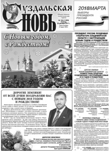 Газета основана 21 марта 1918 г. № 104 (11853) пятница, 29 декабря 2017 г. Общественнополитическая газета Новогодние праздники проникнуты особой атмосферой тепла и веры в самое лучшее. В эти дни мы подводим итоги уходящего года, строим планы на будущее. Второе десятилетие наша общественная организация «Милосердие и порядок» системно воплощает в жизнь социально значимые проекты. Они направлены на нравственно-патриотическое воспитание подрастающего поколения, популяризацию спорта, поддержку земляков. В 2017 году мы продолжили реализацию проекта «Передвижной центр здоровья». За два года работы бесплатные обследования прошли свыше 90 тысяч жителей Владимирской области. Более 435 тысяч человек посетили единственный в России бесплатный кинотеатр. Установлены более 100 детских игровых и спортивных площадок в рамках проекта «Дворы для детворы». ДОРОГИЕ ЗЕМЛЯКИ! ОТ ВСЕЙ ДУШИ ПОЗДРАВЛЯЮ ВАС С НОВЫМ 2018 ГОДОМ И РОЖДЕСТВОМ! Впереди у нас много планов! Вместе с вами в наступающем году мы продолжим реализовывать наши проекты и разрабатывать новые - на благо жителей Владимирского края. Спасибо вам за идеи и предложения, которые находят отражение в нашей работе! ДОРОГИЕ ЗЕМЛЯКИ! От всего сердца желаю вам крепкого здоровья, счастья, семейного благополучия! Пусть в ваших домах царят согласие, добро и любовь! С уважением, депутат Государственной Думы РФ Григорий АНИКЕЕВ. С Новым годом, с Рождеством! Фото В. Сухова. ПРЕЗИДЕНТ РОССИИ ПОЗДРАВИЛ ГУБЕРНАТОРА ВЛАДИМИРСКОЙ ОБЛАСТИ С НАСТУПАЮЩИМ НОВЫМ ГОДОМ И РОЖДЕСТВОМ Президент России Владимир Путин поздравил Губернатора Светлану Орлову, а в её лице и всех жителей Владимирской области с наступающим Новым годом и Рождеством. «В эти особые дни, наполненные приятными хлопотами и предвкушением чуда, в каждом доме царит атмосфера праздника, звучат искренние пожелания счастья и благополучия, строятся планы на будущее. Пусть наступающий год оправдает наши мечты и ожидания, будет щедрым на добрые дела и перемены к лучшему. Крепкого Вам здоровья, успехов и удачи», - говорится в поздравлении главы государства. Губернатора области Светлану Орлову, а в ее лице и всех жителей Владимирской области поздравили с Новым годом и Рождеством также Валентина Матвиенко, председатель Совета Федерации Федерального Собрания РФ, председатель Правительства России Дмитрий Медведев. Пресс-служба администрации области. УВАЖАЕМЫЕ СУЗДАЛЬЦЫ! ПРИМИТЕ САМЫЕ ТЁПЛЫЕ ПОЗДРАВЛЕНИЯ С НОВЫМ ГОДОМ И РОЖДЕСТВОМ ХРИСТОВЫМ! Новогодние праздники всегда были особенными. Они проникнуты атмосферой доброты, душевного тепла, домашнего уюта, и, конечно, верой в то, что самые заветные желания непременно сбудутся. На пороге нового 2018 года мы подводим итоги года минувшего и строим планы на будущее. Уходящий год был непростым, но мы завершаем его с достойными результатами. В этом есть заслуга каждого жителя нашего района. Мы вместе шли к намеченным целям, вместе работали на благо нашей малой Родины. Каким будет наступающий год – зависит только от нас с вами, от нашей целеустремленности, инициативности, желания сделать нашу жизнь еще лучше. Пусть новый 2018 год принесет в каждую семью мир и согласие, благополучие и достаток, радость и гармонию. От всей души желаем вам счастья, здоровья и исполнения самых заветных желаний! А.П. САРАЕВ, Глава Суздальского района. 