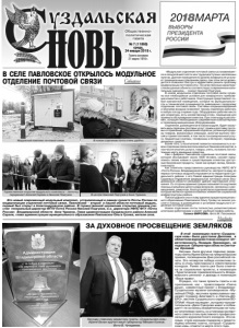 Газета основана 21 марта 1918 г. № 7 (11860) среда, 24 января 2018 г. Общественнополитическая газета В этой номинации газета «Суздальская новь» была удостоена Диплома в областном журналистском конкурсе «Ответственность. Позиция. Признание», за подписью Губернатора области Светланы Орловой. Награда была вручена главному редактору газеты Ирине Белан на губернаторском приеме, посвященном Дню российской печати. Это четвертая победа коллектива газеты в столь престижном и ответственном конкурсе. Ранее газета уже была отмечена за социальные проекты, в номинации «Туристическая привлекательность Владимирского региона» и дважды в номинации «Ваше право». Отрадно, что такие проекты газеты и ее приложения, как - православное «Свеча души», совместный проект с ВладимироСуздальским музеем-заповедником «Музейный ГРАД», вестники православных гимназий г. Суздаля «Благовест» и «Глаголь ДОБРО», вестник Суздальского отделения ВООПИиК «Наше наследие», историко-просветительское «Дело Суворова живет и побеждает!» не остались незамеченными не только читателями газеты, но и членами экспертного совета столь престижного профессионального журналистского конкурса. Эта награда стала хорошим подарком к предстоящему юбилею газеты, который «Суздальская новь» отметит в марте этого года. «Модульное отделение почтовой связи устанавливается в сельской местности или труднодоступных населенных пунктах. Данное помещение по уровню комфорта не уступает традиционным отделениям связи, при этом легко возводится и позволяет быстро и эффективно решить проблему модернизации почтовой сети. По качественным характеристикам данные объекты соответствуют современным капитальным зданиям», - сказал Николай Подгузов. В новом модульном отделении почтовой связи созданы все необходимые условия для комфортного пребывания клиентов и работников. Конструкция представляет собой компактное помещение, которое по функциональности и технической оснащенности равноценно городскому отделению почтовой связи. Системы кондиционирования и обогрева воздуха позволяют такому отделению работать в любую погоду и время года. Оборудовано рабочее место для оператора, есть хозяйственный отсек, помещение для приема и обслуживания клиентов. При этом модуль автономен, оснащен необходимым современным компьютерным и телекоммуникационным оборудованием. Отделение, размещенное в новом модуле, будет оказывать весь перечень почтовых услуг: прием и доставку почтовых отправлений, оформление подписки, розничную продажу товаров, финансовые операции, включая выплату пенсий и прием платежей, в том числе за коммунальные услуги, бюджетные платежи, телефонию и Интернет, переводы денежных средств. Более того, у посетителей появится возможность в новом отделении связи воспользоваться банковской картой, в том числе оплатить услуги, товары, снять, положить на платежную карту денежные средства. Уже с февраля Павловское отделение почтовой связи, которое обслуживает около 1800 человек, сможет предложить своим новым и существующим клиентам доступные банковские продукты, такие как кредит, вклад, банковская карта. Как отметили представители руководства УФПС ФГУ «Почта России» Владимирской области, неспроста один из первых почтовых модулей открывается на территории Суздальского района: с его Главой адм