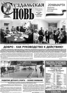 Газета основана 21 марта 1918 г. № 9 (11862) среда, 31 января 2018 г. Общественнополитическая газета ВЫСТАВКА-РАСПРОДАЖА ТРИКОТАЖА И ТЕКСТИЛЯ ИЗ г. ИВАНОВО НОСКИ х/б, 5 пар ..................... 100 руб. НОСКИ МОХРА, 3 пары ...........100 руб. КОЛГОТКИ/ГАМАШИ..........от 150 руб. ШТАНЫ (камуфляж) ............. от 500 руб. ПИЖАМА ДЕТСКАЯ ................350 руб. ДЖИНСЫ (муж./жен.) ..........от 650 руб. ШТАНЫ СПОРТ (муж./жен.) . от 250 руб. ТЕРМО ТРИКО ....................от 350 руб. ТРЕНИКИ, х/б...................... от 150 руб. РУБАШКИ (муж.) ................. от 350 руб. ТРУСЫ (муж./жен.)................. от 50 руб. КУРТКИ ЖЕНСКИЕ (весна/осень) .......................................... от 2000 руб. КУРТКИ ЗИМА (муж./жен.).....3100 руб. КУРТКИ МУЖСКИЕ (осень) .......................................... от 2000 руб. КУРТКИ (подрост.) ............. от 1500 руб. КОЛГОТКИ (дет.) ................от 100 руб. ФУТБОЛКИ (дет.) ...............от 100 руб. ТРУСЫ (дет.), 3 шт. .................100 руб. ФУТБОЛКИ (муж./жен.) .......от 150 руб. КОФТА (дет.) ......................от 250 руб. ТУНИКИ ..............................от 250 руб. МАЙКА (муж./жен.) ..............от 100 руб. ПОЛОТЕНЦЕ БАННОЕ .......от 350 руб., ПОЛОТЕНЦА, 2 шт. .................150 руб. НОСОВЫЕ ПЛАТКИ, 10 шт. ....150 руб. ТАПКИ ДОМАШНИЕ ...........от 100 руб. ДЛЯ ПЕНСИОНЕРОВ - СКИДКА 1000 РУБ. НА ЗИМНЮЮ КУРТКУ ПОСТЕЛЬНЫЕ ПРИНАДЛЕЖНОСТИ: ПОДУШКИ (70/70,50/70) – от 300 руб., ОДЕЯЛА (1,5.2 евро) – от 700 руб., ПЛЕД ОБЛЕГЧЕННЫЙ – от 500 руб., НАВОЛОЧКИ, ПРОСТЫНИ – от 150 руб. КПБ (бязь)1.5 сп. – от 450 руб., КПБ (сатин) 1.5 сп. – от 850 руб. и многое другое ИП Орехов П.К. ОГРН 317435000002457 Реклама Руководство учреждения в лице директора Владимира Сергеевича Зиборова в рамках акции пригласило руководителей ряда учреждений для того, чтобы подписать с ними соглашение о сотрудничестве по различным направлениям добровольческой деятельности, таким как - оказание адресной помощи гражданам пожилого возраста и инвалидам, культурно-просветительской деятельности, организации праздничных и досуговых мероприятий. В подписании соглашения приняли участие Анна Петрова, директор ГБУСОВО «Комплексный центр социального обслуживания населения Суздальского района», Сергей Юдин, директор МБОУ «Средняя общеобразовательная школа №1 г. Суздаля», Ирина Степанова, начальник территориального отдела социальной защиты населения по Суздальскому району. В числе приглашенных была и главный редактор районной газеты «Суздальская новь» Ирина Белан. Кстати, сотрудничество с газетой у учреждения уже существует - журналисты занимаются наполнением и продвижением сайта дома-интерната, размещают информацию о нем в газете. Окончание на 2 стр. ДОБРО - КАК РУКОВОДСТВО К ДЕЙСТВИЮ! 29 января в учреждениях социальной защиты и социального обслуживания населения во всех территориях Владимирской области прошла благотворительная акция «Мы выбираем добро!» Ее организатором выступил департамент социальной защиты населения администрации области. Акция проводится в рамках Года добровольца, который стартовал в 2018 году в соответствии с Указом Президента России Владимира Путина. Прошла акция и в ГБУСО Владимирской области «Суздальский дом-интернат для престарелых и инвалидов» в г. Суздале. А. Петрова, И. Белан, И. Степанова, С. Зиборов, Е. Бобкова, С. Юдин. С. Зиборов проводит экскурсию по Суздальскому дому-интернату. Инициатором мероприятия стало Владимирское региональное отделение общества «Динамо». Турнир прошел при поддержке грантовой программы депутата Госдумы Григория Аникеева. В своей работе депутат уделяет особое внимание организации 