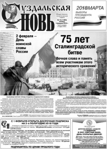 Газета основана 21 марта 1918 г. № 10 (11863) пятница, 2 февраля 2018 г. Общественнополитическая газета Бронирование по тел. 8-920-922-40-69 или на сайте www.svbani.ru ДОРОГИЕ ЖИТЕЛИ г.СУЗДАЛЯ! 13 ФЕВРАЛЯ В ООО «СВЕТЛЫЕ БАНИ» ДЕНЬ ОТКРЫТЫХ ДВЕРЕЙ! Для всех, кто у нас еще ни разу не был, весь день с 10 часов утра до последнего клиента стоимость двухчасовой аренды бани на компанию до 6 человек: - 500 рублей русский зал - 750 рублей классический зал. Реклама С 1 ФЕВРАЛЯ ОТКРЫТА ДОСРОЧНАЯ ПОДПИСКА НА 2-е ПОЛУГОДИЕ 2018 ГОДА Стоимость подписки на газету «Суздальская новь» через почтовые отделения города и района составит на 1 месяц – 86 рублей 26 копеек, на 6 месяцев – 517 рублей 56 копеек. Обращаем ваше внимание, что ветераны, пенсионеры могут подписаться по льготной цене: на один месяц - 74 рубля 01 копейка, на 6 месяцев – 444 рублей 06 копеек. Напоминаем вам, уважаемые читатели, что вы можете оформить подписку и через редакцию газеты. Стоимость на один месяц с доставкой на адрес (не менее 5 экземпляров) – 55 рублей, на 6 месяцев - 330 рублей, чтобы забирать газету в редакции стоимость на 1 месяц - 50 рублей, на 6 месяцев - 300 рублей. Уважаемые жители сел: Омутское, Порецкое, Павловское, Торчино, пос. Красногвардейский, вы также можете выписать газету через редакцию. Стоимость подписки на 1 месяц - 60 рублей, на 6 месяцев - 350 рублей. Оформить подписку можно с любого месяца. Справки по телефону 2-08-95. ПОДПИШИТЕСЬ ПО ЦЕНАМ ПРОШЛОГО ГОДА! Реклама УВАЖАЕМЫЕ ЖИТЕЛИ ГОРОДА СУЗДАЛЯ И СУЗДАЛЬСКОГО РАЙОНА! 2 февраля - один из знаковых дней в истории России. В 1943 году советские войска победили в одном из самых тяжелых сражений Великой Отечественной войны - Сталинградской битве. Это крупнейшее сухопутное сражение в истории человечества. Сталинградская битва стала переломным моментом Второй мировой войны. 200 дней и ночей на берегах Волги шли ожесточенные бои. Беспримерное мужество, несгибаемая воля, стойкость духа, героизм стали основой Победы, которая коренным образом повлияла на ход Великой Отечественной войны. В этот день мы вспоминаем всех, кто, не щадя себя, сражался за нашу свободу и счастье. Вечная память всем, кто не вернулся из боя, почет и уважение тем, кто продолжает олицетворять собой величие народного подвига в битве с фашизмом. Уважаемые ветераны, мы благодарны вам за ваш подвиг и самоотверженность. Ваши мужество и стойкость навсегда останутся для нас примером героизма! Желаем вам крепкого здоровья, стабильности, ясного неба над головой, добра, любви, благополучия, радости! А.П. САРАЕВ, Глава администрации Суздальского района. В.В. КИРИЛЛОВ, Глава Суздальского района, председатель Совета народных депутатов. УВАЖАЕМЫЕ ЖИТЕЛИ СУЗДАЛЬСКОГО РАЙОНА, ДОРОГИЕ ВЕТЕРАНЫ ВЕЛИКОЙ ОТЕЧЕСТВЕННОЙ ВОЙНЫ! Сегодня мы отмечаем 75-ю годовщину разгрома немецко-фашистских войск под Сталинградом. 2 февраля 1943 года завершилось величайшее сражение, ознаменовавшее собой коренной перелом в ходе всей Второй мировой войны. В битве на Волге не только был физически уничтожен враг, но и навсегда развеян миф о непобедимости фашистской армии. Сталинград стал олицетворением беспримерного мужества советских людей, их несгибаемой воли. Уважаемые ветераны, ваша беззаветная преданность стране, ваши мужество и героизм, проявленные в борьбе за свободу и независимость Родины, всегда будут служить примером для нас, наших детей, внуков,