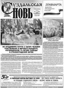 Газета основана 21 марта 1918 г. № 11 (11864) среда, 7 февраля 2018 г. Общественнополитическая газета В Сталинградской битве принимали участие 3,5 тысячи жителей Владимирской области. Четверо из них стали Героями Советского Союза: это старший лейтенант Николай Сыщиков из Владимира, майор Иван Емельянов из Меленковского района, старший лейтенант Николай Харитонов из Суздаля, подполковник Григорий Прованов из Вязниковского района. «Это была великая битва, а день победы в Сталинградской битве – стал днём, навсегда вошедшим в историю», - отметил в своём выступлении ветеран Великой Отечественной войны из Вязников, военный летчик, полковник Вячеслав Кокорин. Ему уже 98 лет, но он по-прежнему бодр и всегда готов рассказать молодым о тех великих годах. О проводимой патриотической работе с подрастающим поколением говорил в своём выступлении председатель Муромского отделения «Боевого братства», участник боевых действий в Афганистане Василий Вахляев. Отметив поддержку автопробегу «Звезда нашей Великой Победы» со стороны простых людей, он поблагодарил руководство области за помощь в организации и проведении акции, а также выразил уверенность, что работа в этом направлении будет продолжена. В ходе митинга курсантам Владимирского юридического института было предоставлено почётное право доставить на ретромобиле ЗИС-5 «Полуторка» к Вечному огню на площади Победы корзину с цветами и гирлянду - в память о всех павших. В свою очередь юнармейцы развернули на Соборной площади масштабную копию Знамени Победы. «События тех времён трогают до глубины души. Сталинградская битва стала переломным моментом в ходе Великой Отечественной войны. Сегодня здесь собралось много жителей города, в том числе молодых ребят, которые знают свою историю и гордятся своей страной – и это очень важно», - отметила Светлана Орлова по завершении митинга. Пресс-служба администрации области. ВО ВЛАДИМИРЕ ПОЧТИ 5 ТЫСЯЧ ЧЕЛОВЕК УЧАСТВОВАЛИ В МИТИНГЕ-КОНЦЕРТЕ, ПОСВЯЩЕННОМ 75-ЛЕТИЮ ПОБЕДЫ В СТАЛИНГРАДСКОЙ БИТВЕ 3 февраля на Соборной площади города Владимира состоялся митинг-концерт, посвященный 75-летию победы в Сталинградской битве. Он прошёл по инициативе регионального отделения Всероссийской общественной организации ветеранов «Боевое братство». Всего в торжествах приняли участие почти пять тысяч человек. Среди них - Губернатор Светлана Орлова, её первый заместитель Лидия Смолина, вице-губернаторы Александр Лобаков, Сергей Невзоров и Александр Трутнев, руководители структурных подразделений областной администрации, заместитель председателя Законодательного Собрания Ольга Хохлова, главный федеральный инспектор Сергей Мамеев, глава города Владимира Ольга Деева, заместитель командующего 27-й ракетной армии Владимир Чазов, руководители силовых структур и ведомств, территориальных управлений федеральных органов власти, ветераны, представители трудовых коллективов, региональных отделений «Юнармии» и «Боевого братства». III РАЙОННЫЙ ФОРУМ-ВЫСТАВКУ 50 ПЛЮС – ВСЕ ПЛЮСЫ ЗРЕЛОГО ВОЗРАСТА НА ПЛОЩАДКЕ СУЗДАЛЬСКОГО РАЙОНА – «ВОЗРАСТ ЖИЗНИ НЕ ПОМЕХА» Администрация Владимирской области • Департамент социальной защиты населения • Администрация Суздальского района • WWW.50PLUS.RU • Место проведения: ЦКД г.Суздаля (Красная площадь, д.5). Время работы выставки: с 11.00 до 15.00. Уважаемые 