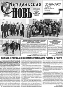 Газета основана 21 марта 1918 г. № 14 (11867) пятница, 16 февраля 2018 г. Общественнополитическая газета УВАЖАЕМЫЕ ВОИНЫ-ИНТЕРНАЦИОНАЛИСТЫ, УЧАСТНИКИ БОЕВЫХ ДЕЙСТВИЙ, ВЕТЕРАНЫ ЛОКАЛЬНЫХ КОНФЛИКТОВ, ЖИТЕЛИ СУЗДАЛЬСКОГО РАЙОНА! 15 февраля 1989 года последняя колонна советских войск покинула Афганистан. В этот день мы отдаем дань уважения тем, кто самоотверженно и мужественно исполнял свой воинский долг, защищая интересы Родины, за пределами нашей страны. Эти войны стали большой трагедией для нашего Отечества, сломали жизнь многим молодым ребятам, навсегда оставили в сердцах поколений глубокую незаживающую рану. Среди солдат, отдавших свои молодые жизни в этих жестоких войнах, есть наши земляки: лейтенант Станислав Белкин, младшие сержанты Вадим Сасаев и Анатолий Шипицын, рядовые Михаил Успенский, Анатолий Крюков, Роман Левченко, Сергей Попов и Сергей Крюков. Мы помним каждое имя и вместе с родными и близкими разделяем боль и горечь утрат. Уважаемые земляки, участники боевых действий! От души желаем вам, вашим родным и близким, семьям и родственникам погибших воинов здоровья, счастья, мира, добра и мирного неба над головой! В.В. КИРИЛЛОВ, Глава Суздальского района. А.П.САРАЕВ, Глава администрации Суздальского района. 15 февраля в Центре культуры и досуга города Суздаля собрались ветераны локальных войн и конфликтов. 29 лет назад ограниченный контингент советских войск покинул Афганистан. Произошло это в праздник Сретения Господня – а ничего случайного, как известно, не бывает. Почти 10-летняя война, которая стоила стране самых больших потерь после Великой Отечественной – 15 тысяч убитых и 54 тысячи раненых, подошла к концу. Это, по сути, наш зимний День Победы... В зале ЦКД в основном собрались те, кто воевал в Афганистане и в Чечне. На мероприятие пригласили многих, и пожилых, и молодых – люди собрались, чтобы в очередной раз отметить День памяти воинов-интернационалистов и тех, кто погиб в других локальных конфликтах при выполнении своих воинских обязанностей. Напомним, что из Суздальского района в локальных конфликтах участвовали более 150 человек. Пусть не все присутствовали в зале, но приехали многие, включая матерей и родственников погибших. Глава администрации района Алексей Сараев отметил, в первую очередь, героизм советских солдат и офицеров, их силу духа. «Это день памяти и глубокого уважения ко всем, кто проявил истинный патриотизм и сумел исполнить свой воинский долг до конца. Война – это всегда тяжелое испытание и для государства, и для его граждан. Мы гордимся мужеством всех наших соотечественников, и наших земляков в том числе», - сказал он. Свою сердечную признательность воинам-интернационалистам выразили глава администрации Суздаля Сергей Сахаров, военный комиссар по г. Суздалю и Суздальскому району Владимир Старостин, председатель районного Совета ветеранов войны, труда, Вооружённых Сил и правоохранительных органов Александр Панфилов. Военком наградил часть ветеранов памятными медалями Министерства обороны «100 лет Вооруженным Силам». И сообщил, что в течение года их получат все ветераны Суздальского района. Во время мероприятия присутствующие выразили благодарность матерям всех вышеназванных защитников Отечества. Минутой молчания помянули всех военнослужащих, и в том числе суздальцев, погибших при выполнении своего во