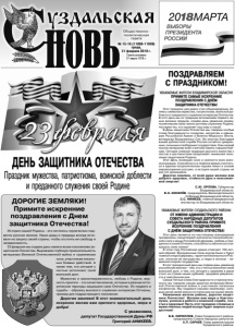 Газета основана 21 марта 1918 г. № 15-16 (11868-11869) среда, 21 февраля 2018 г. Общественнополитическая газета УВАЖАЕМЫЕ ЖИТЕЛИ ВЛАДИМИРСКОЙ ОБЛАСТИ! ПРИМИТЕ САМЫЕ ИСКРЕННИЕ ПОЗДРАВЛЕНИЯ С ДНЁМ ЗАЩИТНИКА ОТЕЧЕСТВА! Этот праздник уже давно стал общенародным, являясь символом мужества, патриотизма, воинской доблести и преданного служения интересам Отечества. В этот день мы по традиции вспоминаем подвиги наших великих предков, отдаём дань уважения людям, посвятившим свою жизнь ратному служению Родине, чествуем тех, кто охраняет наш мир и покой. В День защитника Отечества мы говорим особые слова благодарности солдатам, матросам и офицерам Российской Армии и Военно-Морского Флота, ветеранам Вооруженных Сил. Во многом благодаря вашей доблестной службе Россия остаётся суверенным, сильным и свободным государством. Наш низкий поклон ветеранам войн и вечная память павшим бойцам. Сегодня славные традиции русского воинства с честью и достоинством продолжает нынешнее поколение защитников Родины. Этот День посвящен силе и смелости всех военнослужащих. Способность в тяжёлое время сплотиться в едином патриотическом порыве лежит в основе мировоззрения россиян, и история нашей страны не раз это доказывала. Дорогие земляки, от всей души желаем вам доброго здоровья, стойкости духа и неиссякаемой энергии! С.Ю. ОРЛОВА, Губернатор Владимирской области. В.Н. КИСЕЛЁВ, председатель Законодательного Собрания Владимирской области. С.С. МАМЕЕВ, главный федеральный инспектор по Владимирской области. Праздник мужества, патриотизма, воинской доблести и преданного служения своей Родине ДЕНЬ ЗАЩИТНИКА ОТЕЧЕСТВА ДОРОГИЕ ЗЕМЛЯКИ! Примите искренние поздравления с Днем защитника Отечества! С уважением, депутат Государственной Думы РФ Григорий АНИКЕЕВ. Мужество и самоотверженность, любовь к Родине, верность присяге – это качества воинов, которые в разные исторические периоды защищали свое Отечество. Их подвиги и судьбы - образец высокого служения интересам Отчизны, пример для подрастающего поколения. Дорогие земляки! В этот знаменательный день искренне желаю вам крепкого здоровья, мира и добра! История нашей Родины - это летопись героических подвигов русских воинов. Наши деды и прадеды всегда вставали на защиту своей страны, чтобы отстоять ее свободу и независимость. 23 февраля мы отдаем дань памяти всем поколениям защитников Отечества. Выражаем глубокую признательность ветеранам Великой Отечественной войны и труженикам тыла, участникам локальных боевых действий. А также тем, кто сегодня с честью исполняет свой воинский долг. УВАЖАЕМЫЕ ЖИТЕЛИ СУЗДАЛЬСКОГО РАЙОНА! ОТ ИМЕНИ АДМИНИСТРАЦИИ И СОВЕТА НАРОДНЫХ ДЕПУТАТОВ СУЗДАЛЬСКОГО РАЙОНА ПРИМИТЕ ИСКРЕННИЕ ПОЗДРАВЛЕНИЯ С ДНЁМ ЗАЩИТНИКА ОТЕЧЕСТВА! Этот день является по-настоящему всенародным праздником, олицетворяет для многих поколений россиян силу и мощь Российской державы, любовь и преданность своей Отчизне, способность заботиться и защищать свою семью! В этом году Российская армия отмечает 100-летний юбилей. Вооруженные Силы всегда были и будут главной опорой державы, гарантом безопасности России, оплотом ее могущества, а люди в погонах - надежной опорой государства. В этот праздничный день мы отдаем дань уважения российским воинам – тем, кто с честью выполнил свой воинский долг, и тем, кто сегодня с оружи