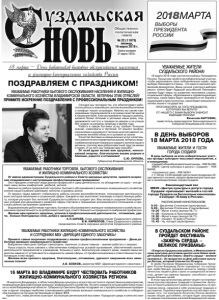 Газета основана 21 марта 1918 г. № 22 (11875) пятница, 16 марта 2018 г. Общественнополитическая газета УВАЖАЕМЫЕ ЖИТЕЛИ СУЗДАЛЬСКОГО РАЙОНА! 18 марта 2018 года состоятся выборы Президента России. Прошу вас прийти на избирательные участки, чтобы реализовать свое избирательное право, ведь выборы Президента страны - это одно из высших проявлений демократии. Ваше личное участие в выборах решит, каким будет будущий российский Президент, какими будут меры по развитию экономики страны, социальной сферы, образования и здравоохранения, культуры, какие меры будут приниматься по борьбе с коррупцией и преступностью, какой будет внешняя политика нашего государства. ПРОГОЛОСУЙТЕ ЗА ТОГО ПРЕЗИДЕНТА, КОТОРОМУ ВЫ ВЕРИТЕ! ОТ НАШЕГО С ВАМИ ВЫБОРА ЗАВИСИТ БУДУЩЕЕ РОССИИ! Вячеслав КАРТУХИН, заместитель председателя Законодательного Собрания Владимирской области. ПОЗДРАВЛЯЕМ С ПРАЗДНИКОМ! Сегодня мы чествуем тех, кто обеспечивает работоспособность важнейших систем жизнеобеспечения и комфорт наших сограждан. Именно вы своим каждодневным трудом меняете к лучшему качество жизни в нашем регионе, благоустраиваете города и районы, делаете более тёплыми и уютными наши дома, поддерживаете чистоту и порядок во дворах и на улицах без скидок на капризы природы и время года. Работа в сфере бытовых услуг требует больших знаний, самоотдачи и терпения. От вашего профессионализма и душевного тепла во многом зависит настроение жителей области и условия их жизни. Качество бытовых и коммунальных услуг, капитального ремонта многоквартирных домов, вопросы водоснабжения волнуют буквально каждого жителя нашего региона, поэтому ваш добросовестный труд так важен и нужен. И за него мы говорим вам спасибо! От всей души желаю вам здоровья, неиссякаемой энергии, благополучия вашим родным и близким, радости и оптимизма! С.Ю. ОРЛОВА, Губернатор Владимирской области. УВАЖАЕМЫЕ РАБОТНИКИ БЫТОВОГО ОБСЛУЖИВАНИЯ НАСЕЛЕНИЯ И ЖИЛИЩНОКОММУНАЛЬНОГО ХОЗЯЙСТВА ВЛАДИМИРСКОЙ ОБЛАСТИ, ВЕТЕРАНЫ ЭТИХ ОТРАСЛЕЙ! ПРИМИТЕ ИСКРЕННИЕ ПОЗДРАВЛЕНИЯ С ПРОФЕССИОНАЛЬНЫМ ПРАЗДНИКОМ! 18 марта – День работников бытового обслуживания населения и жилищно-коммунального хозяйства России УВАЖАЕМЫЕ РАБОТНИКИ ТОРГОВЛИ, БЫТОВОГО ОБСЛУЖИВАНИЯ И ЖИЛИЩНО-КОММУНАЛЬНОГО ХОЗЯЙСТВА! От имени администрации Суздальского района и Совета народных депутатов примите искренние поздравления с наступающим профессиональным праздником! Этот праздник отмечают люди разных профессий и сфер деятельности, но объединяет их одно - они делают нашу жизнь комфортной, удобной, уютной. Именно по работе предприятий торговли, бытового обслуживания и жилищно-коммунального хозяйства жители нашего района оценивают качество и уровень жизни. От вашего труда зависят стабильность работы систем жизнеобеспечения, полноценная деятельность всех секторов экономики и социальной сферы. Каждый из вас выполняет значимую и ответственную работу, которая улучшает быт жителей Суздальского района и создает уют. Ваш вклад в создание благоприятных условий для дальнейшего развития сферы торговли и повышения экономического потенциала и престижа района заслуживает уважения. Выражаем всем работникам торговли, бытового обслуживания и жилищно-коммунального хозяйства искреннюю признательность за добросовестный труд, ответственность и преданность 