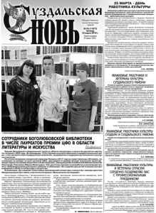 Газета основана 21 марта 1918 г. № 24 (11877) пятница, 23 марта 2018 г. Общественнополитическая газета Ольга Андон, победитель 1 Всероссийского конкурса «Библиотекарь года-2013», автор и руководитель разных просветительских проектов и программ. Марина Павлинова, библиотекарь Боголюбовской библиотеки. Она охотно делится с детьми своими знаниями в области мультимедийных технологий и проводит мастер-классы по созданию видеороликов. Под ее руководством в библиотеке возник и активно развивается Театр книги «BOOKва». Любой школьник поселка может после учебы прийти в «Библиопродленку». Со вторника по пятницу и в воскресенье ребята могут в тихой и уютной обстановке сделать школьные домашние задания, воспользоваться необходимой литературой, обратиться за помощью к электронным ресурсам. В творческих мастерских школьники изготавливают поделки из бумаги и пластилина, участвуют в мастер-классах оригами, DIY - что-то типа сделай сам. Ребята с интересом участвуют в литературных играх, викторинах, экологических марафонах, литературных квестах. В дни каникул в рамках проекта «Библиопродленка» в библиотеке проходят занятия кинолектория «Детский кинозал». Этот проект еще раз доказал, что библиотека может стать местом, где каждый ребенок может не только почитать книгу или журнал, но и сделать уроки, посмотреть выставку, пообщаться с друзьями, интересно провести досуг. Просветительская деятельность сотрудников превратила Боголюбовскую библиотеку в одно из самых доступных и посещаемых мест в поселке. XIII торжественная церемония вручения премии Центрального федерального округа в области литературы и искусства состоится 27 марта в Музее русской иконы в Москве. Поздравляем лауреатов и желаем дальнейших успехов в работе! О. СМИРНОВА. Фото автора. СОТРУДНИКИ БОГОЛЮБОВСКОЙ БИБЛИОТЕКИ В ЧИСЛЕ ЛАУРЕАТОВ ПРЕМИИ ЦФО В ОБЛАСТИ ЛИТЕРАТУРЫ И ИСКУССТВА 25 МАРТА - ДЕНЬ РАБОТНИКА КУЛЬТУРЫ Уважаемые работники культуры и деятели искусства Владимирской области, дорогие ветераны отрасли! Искренне поздравляю вас с профессиональным праздником – Днём работника культуры! Сохранение для современников и будущих поколений главных ценностей: родного языка и литературы, народных традиций и культурного наследия, всего, что является духовным потенциалом Владимирской области – очень благородная и ответственная миссия. Люди вашей профессии – яркие, увлечённые, инициативные. Вы насыщаете культурную жизнь нашего региона новыми красками, с честью представляя свои творческие успехи за его пределами. Спектакли театров и концерты творческих коллективов Владимирской области по праву проходят на лучших площадках России и зарубежья, принося нашему региону славу одного из главных национальных культурных центров. Множество интереснейших открытий ожидает посетителей всех возрастов на выставках и в музеях нашего края. Тысячи юных владимирцев охотно занимаются в школах искусств, посещают дома культуры и библиотеки, а значит, растут начитанными, всесторонне образованными, творческими людьми. Отрадно, что всё больше ярких культурных проектов реализует наша молодежь, для которых работники культуры становятся опытными и незаменимыми наставниками. Слова особой признательности я адресую ветеранам отрасли, которые всегда были и остаются примером и моральным ориентиром для после