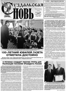 общественнополитическая газета УЗДАЛЬСКАЯ 2 № 27 (11880) среда, 4 апреля 2018 г. ПАМЯТНАЯ ДАТА 100-ЛЕТНИЙ ЮБИЛЕЙ ГАЗЕТА ОТМЕТИЛА ДОСТОЙНО (Окончание. Начало на 1 стр.) Первым свое приветствие газете адресовал Глава администрации Суздальского района Алексей Сараев. Он отметил слаженную, профессиональную работу коллектива и его руководителя, актуальность публикаций, их своевременность, то, что газету читатели любят и всегда ждут нового номера. Накануне юбилейной даты им было подписано постановление о поощрении сотрудников «Суздаль-Медиа» в связи с юбилеем газеты. В торжественной обстановке он вручил Почетные грамоты администрации района: Алексею Антонову, ведущему дизайнеру, Ольге Шуляевой, зав. отделом рекламы. Благодарности: Наталье Ломакиной, главному бухгалтеру, Надежде Подаруевой, бухгалтеру, Ивану Давыдову, дизайнеру, Андрею Григорьеву, водителю. Представители администрации Владимирской области Елена Сатарова, зав. отделом региональных СМИ и Сергей Черемнов, зам. председателя комитета по работе со СМИ приветствовали коллектив газеты от имени Губернатора Владимирской области, зачитав приветственный адрес, в котором, в частности, говорится: «Уважаемые учредители и издатели, сотрудники редакции и ветераны районной газеты «Суздальская новь»! От всей души поздравляю вас и ваших читателей со 100-летием издания! На этом этапе развития «Суздальская новь» неизменно играла роль центра притяжения для всех социальных групп земляков, потому что на ее страницах всегда находилось место для широкого спектра информации, выходящей за формальный стиль официального издания. Сегодня много говорится о духовных скрепах, так как без них невозможно поступательное развитие государства. А наши местные газеты – это одна из важнейших духовных скреп. Потому что в российском обществе всегда был спрос на то, что наш Президент В.В. Путин называет позитивной повесткой дня. Редакция газеты «Суздальская новь» умеет видеть хорошее и в большом, и в малом. Но при этом вы не лакируете действительность, а стараетесь менять ее к лучшему! Отрадно, что одновременно вы меняетесь и сами – осваиваете новые технологии, разрабатываете и реализуете новые проекты. Поэтому, несмотря на вековой юбилей, «Суздальская новь» является современным изданием. Уверена, что залог вашего успеха – в профессиональном руководстве, нацеленном, с одной стороны, на стабильность издания, а с другой стороны - на развитие творческого потенциала сотрудников редакции. Кроме того, вашу газету отличает заботливое отношение к нормам и правилам русского языка, что также очень важно в наше время. Искренне желаю вам доброго здоровья, благополучия вашим близким людям и новых удачных творческих проектов! С.Ю. Орлова, Губернатор Владимирской области». Затем был зачитан указ Губернатора Владимирской области Светланы Орловой о награждении медалью «За заслуги перед Владимирской областью» Ирины Белан, главного редактора газеты «Суздальская новь», которую ей здесь же и вручили. Почетной грамотой администрации области была награждена Галина Фирсова, заместитель директора «Суздаль-Медиа». Поздравления в адрес газеты прозвучали от почетных гостей - Вячеслава Картухина, заместителя председателя Законодательного Собрания Владимирской области, главы администрации г. Суздаля Сергея Сахарова, руково