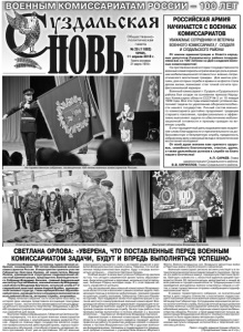 Газета основана 21 марта 1918 г. № 29 (11882) среда, 11 апреля 2018 г. Общественнополитическая газета ВОЕННЫМ КОМИССАРИАТАМ РОССИИ – 100 ЛЕТ 4 апреля во Владимире состоялось торжественное собрание, посвященное 100-летию образования военных комиссариатов России. В мероприятии приняли участие Губернатор Светлана Орлова, её заместитель Михаил Колков, руководители структурных подразделений областной администрации, председатель Законодательного Собрания Владимир Киселев, главный федеральный инспектор Сергей Мамеев, военный комиссар Владимирской области Владимир Кручинин, начальник штаба 27-й гвардейской ракетной армии Андрей Бурбин, руководители силовых структур, главы муниципальных образований региона, руководители и сотрудники военкоматов из всех районов области, ветераны службы, юнармейцы. Перед началом собрания гости осмотрели выставку, на которой свои находки представила ассоциация поисковых отрядов «Гром», воспитанники авиамодельной секции Дворца детского (юношеского) творчества г.Владимира и ДОСААФ продемонстрировали полет радиоуправляемых пилотажных самолётов для залов. Выступая перед собравшимися, Губернатор Светлана Орлова подчеркнула, что вся история военных комиссариатов неразрывно связана с крупнейшими вехами развития России. «Одной из главных задач государства является создание профессиональной действующей армии, хорошо подготовленной и обученной, способной отражать нападение любого противника. И вот уже на протяжении 100 лет военные комиссариаты органично слиты с историей создания и развития Вооруженных Сил нашей страны. Уверена, что поставленные перед военкоматами задачи, будут и впредь выполняться успешно», - отметила Светлана Орлова. Особый акцент в своем выступлении Губернатор сделала на том, что сегодня современной армии нужны образованные, физически крепкие и здоровые, морально подготовленные, любящие Родину молодые люди. И с этой задачей область справляется успешно. «На сегодняшний день военный комиссариат Владимирской области готов и выполняет самые сложные задачи. Неоценимую помощь в вопросах мобилизации, призыва граждан на военную службу оказывает Губернатор Светлана Юрьевна Орлова. При поддержке областной администрации и органов местного самоуправления военный комиссариат Владимирской области уверенно удерживает лидирующие позиции в Западном военном округе по выполнению задания на призыв граждан на военную службу. За все годы работы план призыва всегда выполнялся в полном объеме и с высоким качеством», - подчеркнул облвоенком Владимир Кручинин. Администрация и военный комиссариат Владимирской области в течение длительного времени проводят целенаправленную работу по развитию шефских связей с соединениями и частями Вооруженных Сил РФ и другими воинскими формированиями. Налажены и поддерживаются традиционно добрые отношения с руководством Военно-Морского Флота, Военно-воздушных сил, Воздушно-десантных войск и Ракетных войск стратегического назначения. Военный комиссариат региона активно участвует и в патриотическом воспитании подрастающего поколения. Сегодня эта работа особенно важна, подчеркнула Светлана Орлова. Ежегодно совместно с областной администрацией проводится более 30 патриотических мероприятий и акций во всех районах и городах нашей области. Традиционным с