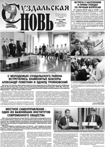 Газета основана 21 марта 1918 г. № 33 (11886) среда, 25 апреля 2018 г. Общественнополитическая газета В спортивном зале ФОКа села Павловское собралось более 120 человек – спортивная общественность, руководители секций и их воспитанники, старшеклассники образовательных учреждений района. Всем хотелось повстречаться со знаменитостями мирового уровня, тем более, что у всех еще на слуху недавняя убедительная победа Александра Поветкина в бою с британцем Дэвидом Прайсом. Пользуясь случаем, В. Картухин поздравил гостей с успешной защитой диссертации магистра в Российской академии народного хозяйства и государственной службы при Президенте РФ. Он отметил, что легендарные спортсмены являются достойным примером для молодежи. Они не только успешно защищают спортивную честь нашей страны на мировой арене, но и совершенствуют свои знания, которые смогут применить в дальнейшем по завершении спортивной карьеры на государственной муниципальной службе. Вообще в процессе общения с молодежью А. Поветкин не раз подчеркивал значение учебы. Приводил ряд примеров, когда спортсмены, занимающиеся единоборствами, становились депутатами Государственной Думы или занимали высокие должности. С МОЛОДЕЖЬЮ СУЗДАЛЬСКОГО РАЙОНА ВСТРЕТИЛИСЬ ЗНАМЕНИТЫЕ БОКСЕРЫ АЛЕКСАНДР ПОВЕТКИН И ЭДУАРД ТРОЯНОВСКИЙ МЕСТНОЕ САМОУПРАВЛЕНИЕ - ОДИН ИЗ ВАЖНЕЙШИХ ИНСТИТУТОВ СОВРЕМЕННОГО ОБЩЕСТВА Встреча состоялась благодаря заместителю председателя Законодательного Собрания области Вячеславу Картухину, возглавляющему Владимирский филиал ГБОУ ВО «Российская академия народного хозяйства и государственной службы при Президенте Российской Федерации», где эти спортсмены учатся. По словам знаменитых боксеров никакого снисхождения им в академии нет. Учение требует времени и немалых усилий. Свои навыки гостям продемонстрировали воспитанники секции кикбоксинга под руководством президента Федерации кикбоксинга Владимирской области Ф. Карамхудоева и тренера-преподавателя В. Комарова. Александр Поветкин и Эдуард Трояновский ответили на вопросы собравшихся. Ребят интересовали спортивные успехи боксеров, как они начали профессиональную карьеру, что нужно для достижения высоких результатов и многое другое. В завершении встречи все желающие получили автографы от знаменитых спортсменов. Встреча произвела большое впечатление на молодых людей. Галина ФИРСОВА. Фото М. Пахомовой. На встрече с ребятами в ФОКе Э. Трояновский, А. Поветкин, В. Картухин. Автограф суздальцам от Александра Поветкина. На встрече автографы от знаменитых спортсменов получили все желающие. Местное самоуправление играет ключевую роль в обеспечении экономического и социального развития района. В Суздальском районе День местного самоуправления торжественно отмечают второй раз. По этому случаю в Дом культуры села Новое были приглашены муниципальные служащие, ветераны муниципальной службы, депутаты Советов народных депутатов, старосты, представители уличных и домовых комитетов – делегации от всех муниципальных образований Суздальского района. На торжественном мероприятии присутствовали главы района, города, сельских поселений, заместитель председателя Законодательного Собрания Владимирской области В. Картухин. О структуре органов местного самоуправления, их работе рассказал в своем выступлении 