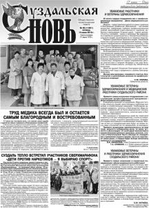 Газета основана 21 марта 1918 г. № 48 (11901) пятница, 15 июня 2018 г. Общественнополитическая газета УВАЖАЕМЫЕ РАБОТНИКИ И ВЕТЕРАНЫ ЗДРАВООХРАНЕНИЯ! От всего сердца поздравляю вас с профессиональным праздником – Днем медицинского работника! Медики – представители одной из самых гуманных и благородных профессий. Врачевание – настоящее искусство, требующее глубоких профессиональных знаний, высочайшей ответственности, терпения, доброты и милосердия. В ваших руках - самое ценное, что есть у человека – жизнь и здоровье. Вы ежедневно и ежечасно соприкасаетесь с человеческой болью, спасаете людей, излечиваете их от тяжелых недугов. Охрана и укрепление здоровья людей, повышение качества и доступности медицинской помощи, сохранение и приумножение человеческого капитала, о чем в Послании Федеральному Собранию говорил Президент России Владимир Владимирович Путин, – наши важнейшие приоритетные задачи. Во Владимирской области из года в год растет финансирование здравоохранения, строятся современные больничные корпуса, открываются новые фельдшерско-акушерские пункты, закупаются новые мобильные медицинские комплексы и санитарный автотранспорт, внедряются самые современные методы диагностики и лечения. Впереди у нас еще большая, кропотливая работа, которую мы обязательно выполним. Дорогие друзья! Искренне благодарю вас за добросовестный труд и преданность своему благородному делу. Желаю вам здоровья, семейного счастья, благополучия и дальнейших успехов на профессиональном поприще! С.Ю. ОРЛОВА, Губернатор области. Под вечер 9 июня суздальцы приветствовали в своём древнем городе участников сверхмарафона, который был организован Московской областной организацией «Сверхмарафонцы - за здоровый образ жизни». В нынешнем году в традиционном детско-юношеском легкоатлетическом сверхмарафоне приняли участие 30 детей от 10 до 16 лет, а также 15 взрослых сопровождающих. За 12 дней они пробежали почти тысячу километров по Московской, Ярославской, Костромской, Ивановской, Владимирской областям. Старт многодневному марафону был дан 1 июня в День зашиты детей в Москве от Воскресенских Ворот Красной площади от отметки «0» километр. Финиш пробега состоялся в Москве на Поклонной горе в День России, 12 июня. Посвящён пробег памяти двух людей. Это врач с мировым именем, сверхмарафонец Эдуард Яковлев и генерал Александр Сергеев – легендарный борец с наркопреступностью, который стоял у истоков создания органов по борьбе с незаконным оборотом наркотиков. На Суздальской земле участников сверхмарафона встретили местные юные спортсмены. Все вместе они пробежали по Суздалю к ЦКД, где состоялась официальная встреча-митинг. Во время движения и последующего митинга безопасность участников и правопорядок на мероприятии обеспечивали сотрудники ОМВД России по Суздальскому району (представители ОГИБДД и ППС). О пагубности наркотиков и плюсах спортивного образа жизни молодёжи говорили депутат Совета народных СУЗДАЛЬ ТЕПЛО ВСТРЕТИЛ УЧАСТНИКОВ СВЕРХМАРАФОНА «ДЕТИ ПРОТИВ НАРКОТИКОВ – Я ВЫБИРАЮ СПОРТ!» УВАЖАЕМЫЕ ВЕТЕРАНЫ ЗДРАВООХРАНЕНИЯ И МЕДИЦИНСКИЕ РАБОТНИКИ СУЗДАЛЬСКОГО РАЙОНА! Примите самые искренние поздравления с наступающим профессиональным праздником - Днем медицинского работника. В медицину приходят по призванию. Ведь для того, чтобы помогать людя
