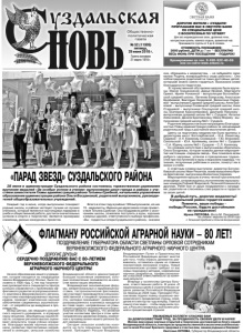 Газета основана 21 марта 1918 г. № 52 (11905) пятница, 29 июня 2018 г. Общественно политическая газета Начало образованию вашего учреждения, которое находится на плодородных землях Владимирского Ополья, было положено в 1938 году. С тех пор талантливые руководители и специалисты Центра успешно справляются с проблемами эффективного развития агропромышленного комплекса Верхневолжского региона, подготовки квалифицированных научных кадров, проводят комплексное научное обеспечение современных агротехнологий – от разработки до внедрения в производство. Вклад Центра, как ведущего российского научного учреждения, в аграрную науку неоценим. Земледельцы нашей области, соседних регионов высоко оценивают результаты труда учёных-аграриев. Благодаря вашим научным изысканиям, развитию перспективных направлений в селекции, сельское хозяйство Владимирской области демонстрирует большие позитивные изменения, которые положительно сказываются на качестве жизни наших земляков. Владимирские экономические форумы, межрегиональные и зарубежные выставки, гастрономические фестивали, где участвуют производители сельскохозяйственной и пищевой промышленности, наглядно показывают: развитие агропромышленного комплекса находится во главе задач, направленных на повышение социально-экономического благополучия области. Надеюсь, что активное участие коллектива Центра в этом целенаправленном движении вперед, изменении к лучшему жизни нашего региона будет неизменным. Сегодня сельское хозяйство находится на пути серьезных преобразований. Президент России Владимир ДОРОГИЕ ДРУЗЬЯ! СЕРДЕЧНО ПОЗДРАВЛЯЮ ВАС С 80-ЛЕТИЕМ ВЕРХНЕВОЛЖСКОГО ФЕДЕРАЛЬНОГО АГРАРНОГО НАУЧНОГО ЦЕНТРА! Владимирович Путин и Правительство Российской Федерации делают многое для того, чтобы отрасль динамично развивалась, оставалась одним из главных локомотивов экономики страны. Новые экономические условия требуют от вас новых подходов и методов, современных научных разработок, профессионализма и высокой ответственности за конечный результат. Впереди у коллектива Центра большая, ответственная работа. В указе «О национальных целях и стратегических задачах развития Российской Федерации на период до 2024 года» Президент России вновь поднял планку социально-экономического продвижения страны, определив его вектор на годы вперёд. Главный смысл этих задач – чтобы люди жили лучше, а Россия становилась всё более сильной и процветающей страной. УВАЖАЕМЫЕ КОЛЛЕГИ! СПАСИБО ВАМ ЗА ДОБРОСОВЕСТНЫЙ ТРУД, ЗА ПРЕДАННОСТЬ СВОЕМУ ДЕЛУ И НАУКЕ! Желаю вам новых научных открытий и творческих достижений во благо нашей Владимирской области, в интересах продовольственной и экологической безопасности всей России! Крепкого здоровья и счастья вам, вашим родным и близким! Светлана ОРЛОВА, Губернатор Владимирской области. Бронирование по тел. 8-920-922-40-69 или на сайте www.svbani.ru ДОРОГИЕ ЖИТЕЛИ г.СУЗДАЛЯ! ПРИГЛАШАЕМ ВАС В СВЕТЛУЮ БАНЮ ПО СПЕЦИАЛЬНОЙ ЦЕНЕ С ВОСКРЕСЕНЬЯ ПО ЧЕТВЕРГ Для вас индивидуальные залы, дровяные печи, контрастные купели, комната отдыха, ароматный чай. Принимаются группы от 4 до 6 человек. СТОИМОСТЬ ПОСЕЩЕНИЯ: 2000 рублей, ДЕТИ до 7 лет – БЕСПЛАТНО ВЕСЬ ИЮНЬ ПРИ ПОСЕЩЕНИИ – ПОДАРОК! Реклама она, обращаясь к медалистам, – не забывайте свою малую Родину, возвращайтесь сюда работать». Она поблагод