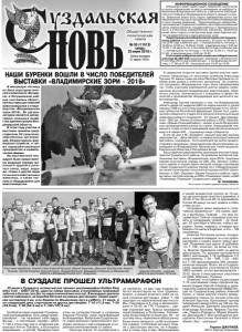 Газета основана 21 марта 1918 г. № 59 (11912) среда, 25 июля 2018 г. Общественно политическая газета ИНФОРМАЦИОННОЕ СООБЩЕНИЕ Избиратель имеет право подать заявление о включении в список избирателей по месту нахождения на выборах Губернатора Владимирской области и депутатов Законодательного Собрания Владимирской области седьмого созыва. Заявление может быть подано избирателем лично при предъявлении паспорта гражданина Российской Федерации в пункт приема заявлений – Территориальную избирательную комиссию Суздальского района, многофункциональный центр предоставления государственных и муниципальных услуг, в участковую избирательную комиссию. Заявление может быть подано в электронном виде через Единый портал государственных и муниципальных услуг. Территориальная избирательная комиссия Суздальского района принимает заявления с 25 июля по 28 августа 2018 года в рабочие дни - с понедельника по пятницу, с 10.00 до 12.00 и с 16.00 до 19.00, в выходные дни с 9.00 до 13.00; с 29 августа по 5 сентября 2018 года в рабочие дни - с понедельника по пятницу, с 10.00 до 12.00 и с 16.00 до 21.00, в выходные дни с 9.00 до 13.00. Участковые избирательные комиссии избирательных участков № 299-342 принимают заявления с 29 августа по 5 сентября 2018 года в рабочие дни - с понедельника по пятницу, с 17.00 до 21.00, в выходные дни с 9.00 до 13.00. НАШИ БУРЕНКИ ВОШЛИ В ЧИСЛО ПОБЕДИТЕЛЕЙ ВЫСТАВКИ «ВЛАДИМИРСКИЕ ЗОРИ - 2018» В минувшую пятницу на базе агротуристического комплекса «Богдарня» в Петушинском районе состоялась областная выставка достижений животноводства и птицеводства «Владимирские зори-2018». Ее организатором является департамент сельского хозяйства администрации Владимирской области. В этом году участие в выставке приняли представители 30 сельскохозяйственных организаций, 20 крестьянско-фермерских хозяйств, а также перерабатывающие предприятия и коммерческие фирмы. На выставочной площадке были представлены ведущие породы молочного крупного рогатого скота, овцы, лошади, птицы и другие виды сельскохозяйственных животных, а также техника и оборудование для животноводства. Участники марафона: второй слева Алексей Круглов, Мария Шмелева, Дмитрий Заозёрский, Лариса Рыжова, Сергей Сахаров, Алексей Кузин, Андрей Жильцов, Владимир Степанов из Ивановской области и Владимир Козлов из с. Черкутино. Особый интерес вызывает Суздальский ультрамарафон. Есть среди трейлраннеров – так называют себя марафонцы – и настоящие «профи»: GRUT Т-100 в этом году уже в четвертый раз выиграл Антон Головин, а Екатерина Андрейцева – в третий. Проверил свои силы на супердистанции и суздалец Алексей Потапов, ныне проживающий во Владимире. Выпускник Суздальского индустриально-гуманитарного колледжа заглянул к нам в редакцию и поделился впечатлениями от забега. - Никогда более 15 километров я В СУЗДАЛЕ ПРОШЕЛ УЛЬТРАМАРАФОН В церемонии открытия выставки принял участие заместитель Губернатора по сельскому хозяйству Александр Трутнев. От имени главы региона Светланы Орловой он пожелал всем успеха и отличного настроения. Он отметил, что программа «Владимирских зорь» была сформирована так, чтобы участники мероприятий смогли увидеть селекционные достижения владимирских животноводов, обменяться опытом, познакомиться с новациями в сфере технологий и производства оборудования для молочного животноводства. Александр Трутне