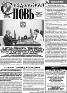 Газета основана 21 марта 1918 г. № 67 (11920) среда, 22 августа 2018 г. Общественнополитическая газета Помимо ситуации в области в целом, большое внимание в ходе общения было уделено вопросам реализации программы развития малых городов. Светлана Орлова поблагодарила Президента за финансовую помощь, которую он выделил ранее в рамках подготовки к празднованию юбилея Гороховца, а также рассказала о федеральных грантах, недавно выигранных Гороховцом и Суздалем. Суть стратегии Губернатора, как известно, заключается в максимальном повышении комфортности жизни в области, превращении региона в такое же уютное пространство, каким для каждого является его собственный дом. Все средства, которые удается получить в федеральном центре, используются как раз для этой цели. Губернатор не просто докладывала главе государства о положении в малых городах Владимирской области, но и решала некоторые конкретные проблемы. Так, ей удалось заручиться поддержкой Президента по вопросу создания в Коврове перинатального центра. Владимир Путин распорядился НА ВСТРЕЧЕ С ПРЕЗИДЕНТОМ РОССИИ СВЕТЛАНА ОРЛОВА НЕ ТОЛЬКО РАССКАЗАЛА ЕМУ О СИТУАЦИИ В ОБЛАСТИ, НО И ДОГОВОРИЛАСЬ О СТРОИТЕЛЬСТВЕ ПЕРИНАТАЛЬНОГО ЦЕНТРА В КОВРОВЕ 16 августа в Москве состоялась рабочая встреча Президента России Владимира Путина с Губернатором Владимирской области Светланой Орловой. выделить на его строительство почти полтора миллиарда рублей федеральных средств. В целом, Светлана Орлова рассказала главе государства, что здравоохранению в регионе уделяется особое внимание. Если раньше больницы и поликлиники не видели ремонта по 50-60 лет, то в настоящее время ремонтируются все без исключения медицинские учреждения. В сельских территориях строятся новые и реконструируются действующие ФАПы. В здравоохранении региона по-прежнему актуальна проблема кадрового голода, но эта проблема уже решается. За последние пять лет в область удалось привлечь 580 врачей. Рассказала Светлана Орлова Президенту и о своей встрече с жителями Струнино. Губернатор отметила, что ремонт зданий больницы уже начался, также будет отремонтирована и прилегающая территория. Отдельно Владимир Путин поинтересовался развитием социальной сферы. Светлана Орлова рассказала, что сегодня на первом месте – школы. Их за последние пять лет было построено восемь. Она сообщила Президенту о выполнении его поручения о завершении строительства школы во Владимире. 1 сентября эта новая школа № 49 примет своих первых учеников. К 2025 году в регионе планируется построить еще 37 школ. В ходе встречи Светлана Орлова также рассказала Владимиру Путину об экономической ситуации в области. Она обратила внимание главы государства на то, что за четыре года валовой региональный продукт вырос на 30 процентов. В качестве инвестиций во Владимирскую область с 2013 года было привлечено 392 млрд. рублей. В регионе открываются новые производства, создаются новые рабочие места. С 2015 года областной бюджет - бездефицитный, то есть бюджетные деньги на выплату банковских процентов больше не тратятся, их можно целиком направлять на развитие. Глава области так прокомментировала результаты встречи: «Самую главную задачу, которую передо мной, как Губернатором региона, поставил Президент Владимир Владимирович Путин – постоянно улучшать качество жизни населения 