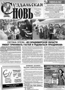 Газета основана 21 марта 1918 г. № 69 (11922) среда, 29 августа 2018 г. Общественнополитическая газета 1 сентября с 10.00 до 18.00 НОВЫЕ МОДЕЛИ В АССОРТИМЕНТЕ НОРКА, МУТОН, ДУБЛЕНКИ СКИДКИ (фабрика г. Пятигорск) *Кредит предоставляет ООО «ХКФ Банк». Лиц. Банка России №316 от 15.03.2012 г. (бессрочная). **Срок проведения акции – 01.09.2018 г. ***Рассрочку предоставляет ИП Низгуренко Н.П. (ОГРН 304682835500011). Реклама АКЦИЯ!** Меняем вашу старую шубу на новую СКИДКА до 25% при покупке новой шубы! Гостиница «Молодежная» (г. Суздаль, ул. Ленина, д. 104) КРЕДИТ* без первого взноса до 3 лет РАССРОЧКА*** на 12 месяцев без процентов ЛЕТНЯЯ РАСПРОДАЖА ШУБ И ДУБЛЕНОК Губернатор Светлана Орлова не раз подчёркивала, что праздник в доме, которым для всех жителей является Владимирская область, и настроение создаёт, и людей объединяет – побуждает их создавать уют для гостей и для себя. Таким праздником, несомненно, стала шестая агрокультурная выставка-ярмарка «Владимирская Русь», которая стартовала 25 августа в рамках Дня города Владимира. Это яркое и радостное мероприятие демонстрировало достижения сельского хозяйства и перерабатывающей промышленности региона. За два дня работы её посетило более 40 тыс. жителей и гостей области. «Агрокультурная ярмарка стала хорошей традицией, здесь каждый район демонстрирует, чем он богат: Суздальский – овощной и молочной продукцией, Юрьев-Польский – мясом и молоком, Гусь-Хрустальный – уникальными изделиями из стекла и хрусталя, Петушинский – знаменитыми сырами, Меленковский – консервами из овощей, Муромский и Ковровский, помимо развитой промышленности – яркими творческими коллективами. Я очень рада, что жители области полюбили отмечать праздники и принимать гостей», – отметила Светлана Орлова. Глава региона вместе с почётными гостями посетила павильоны, в которых была представлена фермерская продукция, изделия мастеров, сувениры с символикой районов нашей области. Светлана Орлова охотно пообщалась с жителями, расспросила фермеров о перспективах урожая в этом сезоне. Откликалась она на просьбы посетителей ярмарки сделать селфи. Многие жители подходили к Губернатору выразить поддержку и благодарность за работу, результатом которой стали масштабные изменения к лучшему во всех сферах жизни региона. Вместе с вязниковскими артистами Светлана Орлова исполнила песню «Гляжу в озёра синие», с популярной французской певицей Кристель Лури – «Подмосковные вечера», а с фольклорным коллективом из Юрьев-Польского района закружилась в зажигательном народном танце. «Я полюбила Владимирскую область, здесь я чувствую вдохновение и счастье, здесь замечательные гостеприимные люди. Губернатор Светлана Орлова – необыкновенная, я больше не знаю таких женщин-руководителей, которые работают так много и так плодотворно, чтобы жизнь людей менялась к лучшему», – поделилась впечатлениями певица Кристель Лури. В этом году агрокультурная выставка-ярмарка проводилась в широком формате сразу на нескольких площадках: в сквере Липки, на площади перед Успенским собором и на Пушкинском бульваре – здесь муниципальные образования региона демонстрировали свой инвестиционный, торгово-экономический и культурно-туристический потенциал. В рамках фестиваля Вкусного питания была представлена продукция предприятий Владимирской области: холдинговой компании «Ополье», м