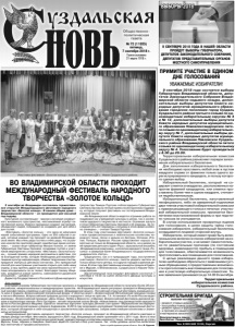 Газета основана 21 марта 1918 г. № 72 (11925) пятница, 7 сентября 2018 г. Общественнополитическая газета Тел. 8 903 648 13 04, Сергей. Реклама СТРОИТЕЛЬНАЯ БРИГАДА выполнит все виды работ: Консультация и замер бесплатно. Скидка 20%. - ремонт старых домов - постройка новых домов - ремонт крыш и фундаментов - и прочее из нашего материала и материала заказчика. 9 СЕНТЯБРЯ 2018 ГОДА В НАШЕЙ ОБЛАСТИ ПРОЙДУТ ВЫБОРЫ ГУБЕРНАТОРА, ДЕПУТАТОВ ЗАКОНОДАТЕЛЬНОГО СОБРАНИЯ, ДЕПУТАТОВ ПРЕДСТАВИТЕЛЬНЫХ ОРГАНОВ МЕСТНОГО САМОУПРАВЛЕНИЯ ВЫБОРЫ-2018 9 сентября 2018 года состоятся выборы Губернатора Владимирской области, депутатов Законодательного Собрания Владимирской области седьмого созыва, дополнительные выборы депутатов Совета народных депутатов муниципального образования городское поселение город Суздаль Суздальского района третьего созыва по одномандатным избирательным округам № 4 и № 12, дополнительные выборы депутата Совета народных депутатов муниципального образования Новоалександровское пятого созыва по одномандатному избирательному округу № 7, дополнительные выборы депутата Совета народных депутатов муниципального образования Павловское Суздальского района Владимирской области пятого созыва по одномандатному избирательному округу № 4. Голосование будет проводиться с 8.00 до 20.00. Территориальная избирательная комиссия Суздальского района разъясняет порядок заполнения избирательного бюллетеня. Для заполнения избирательного бюллетеня необходимо проставить любой знак в пустом квадрате справа от фамилии только одного зарегистрированного кандидата, в пользу которого сделан выбор. Избирательный бюллетень, который не содержит отметок в квадратах, расположенных напротив фамилий кандидатов, или отметки проставлены более чем в одном квадрате, считается недействительным. Избирательный бюллетень, изготовленный неофициально, либо не заверенный подписями двух членов участковой избирательной комиссии с правом решающего голоса и печатью участковой избирательной комиссии, признается бюллетенем неустановленной формы и при подсчете голосов не учитывается. В случае использования прозрачных ящиков для голосования, в целях защиты тайны голосования избирателя, избирательный бюллетень складывается лицевой стороной внутрь. Избирателю, который имеет право быть включенным или включен в список избирателей на избирательном участке, и не может самостоятельно по уважительным причинам (по состоянию здоровья, инвалидности) прибыть в помещение для голосования, обеспечивается возможность проголосовать вне помещения для голосования. С целью реализации данного права избирателю необходимо обратиться с заявлением (устным обращением) о предоставлении возможности проголосовать вне помещения для голосования в участковую избирательную комиссию. Такие заявления принимаются до 14.00 9 сентября. Территориальная избирательная комиссия Суздальского района. УВАЖАЕМЫЕ ИЗБИРАТЕЛИ! ПРИМИТЕ УЧАСТИЕ В ЕДИНОМ ДНЕ ГОЛОСОВАНИЯ 3 сентября во Владимире состоялось торжественное открытие Международного фестиваля народного творчества «Золотое кольцо». В нашем общем доме – Владимирской области – он проводится уже восьмой год подряд. Культурная составляющая – важная слагаемая комфортного жизненного пространства, неотъемлемый атрибут качественной жизни. Именно праздни