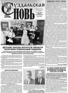 Газета основана 21 марта 1918 г. № 74 (11927) пятница, 14 сентября 2018 г. Общественно политическая газета Поступление трех новых музыкальных инструмента стало большим событием для всей Детской школы искусств им. В.А. Ширшиковой в поселке Садовый и прекрасным подарком преподавателям и ученикам, ведь в 2018 году школе исполняется 40 лет. «Фортепиано «Николай Рубинштейн» пользуется большой популярностью среди профессиональных музыкантов, - говорит директор школы искусств Марина Кошмина. - На этом инструменте играют лауреаты российских и международных конкурсов, а теперь такая возможность предоставлена и ученикам ДШИ п.Садовый, педагогам. В Детской школе искусств им. Ширшиковой 3 сентября уже был проведен концерт, посвященный Дню знаний, 6 сентября - внутришкольный конкурс юных пианистов и ансамблей». По данным департамента культуры администрации Владимирской области, сумма контракта составляет 27,2 миллиона рублей. Поставками новых музыкальных инструментов во все регионы Центрального федерального округа ведет Министерство промышленности и торговли России по поручению Президента России В. Путина. Во Владимирской области обновление фонда музыкальных инструментов в детских школах искусств начато в 2016 году в рамках региональной программы развития культуры. В 2017 году по сравнению с 2015 годом количество приобретаемых музыкальных инструментов увеличилось в три раза. За период 2016-2017 годов в детские школы искусств в рамках областной программы, а также благодаря привлеченным Владимирской областью федеральным средствам, приобретено 260 новых музыкальных инструментов. Школы искусств, которые получили новые инструменты, определяли по ряду критериев, в том числе по внедрению дополнительных предпрофессиональных программ в сфере музыкального искусства. М. ИВАНОВА. Фото автора. ДЕТСКИЕ ШКОЛЫ ИСКУССТВ ОБЛАСТИ ПОЛУЧИЛИ ПРЕКРАСНЫЙ ПОДАРОК Фортепиано в детской школе искусств им. В.А. Ширшиковой в пос. Садовый. В 40 музыкальных школ Владимирской области поставили 76 новых пианино. Государственный контракт на поставку инструментов подписала Губернатор области Светлана Орлова. Владимирская область получит из федерального бюджета 27,8 млн. рублей на реализацию комплексных мероприятий по созданию и модернизации учреждений культурно-досугового типа в сельской местности в 2019 году. Средства планируется направить на развитие учреждений культуры Судогодского и Суздальского районов. На эти деньги в селе Порецком Суздальского района, в котором живет около 1 тысячи человек, будет построен новый клуб площадью 1,9 тыс. кв.м (аварийное здание старого клуба было закрыто в 2015 году). Напомним, в настоящее время в посёлке Боголюбово достраивается Дом культуры. Деньги на его строительство выделены в рамках областной программы развития культуры – в рамках средств, полученных регионом за успехи в социально-экономическом развитии. В 2016 году в этом муниципальном образовании открылась и первая в стране площадка пилотного проекта Минкультуры РФ – модельная библиотека XXI века. В 2017 году Владимирская область приняла участие в реализации федерального проекта «Местный Дом культуры». При поддержке Министерства культуры России, впервые за долгие годы в регионе начали строить Центры и Дома культуры на селе. Пресс-служба администрации области. 27,8 МЛН. РУБЛЕЙ ПОЛУЧИТ ВЛАДИМ