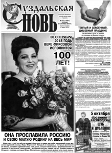 Газета основана 21 марта 1918 г. № 78 (11931) пятница, 28 сентября 2018 г. Общественно политическая газета 5 октября Гостиница «Молодежная» г.Суздаль, ул. Ленина, 104 Рассрочку предоставляет ИП Низгуренко Н.П. (ОГРН 304682835500011). Акция действует 05.10.2018 г. Реклама. ОНА ПРОСЛАВИЛА РОССИЮ И СВОЮ МАЛУЮ РОДИНУ НА ВЕСЬ МИР УВАЖАЕМЫЕ ПЕНСИОНЕРЫ, ВЕТЕРАНЫ ВОЙНЫ И ТРУДА! 1 октября мы отмечаем Международный день пожилых людей, теплый и сердечный праздник. Он служит символом единства и преемственности поколений, связи времен, без которой невозможно нравственное развитие нашего общества. Сегодня в вашем лице мы чествуем наших родителей, наставников, земляков, которые создавали, защищали и сохраняли всё, чем мы по праву гордимся. Многие из вас всю свою трудовую деятельность посвятили Суздальскому району. Работая в школах и больницах, на фермах и полях, в магазинах и учреждениях культуры, вы трудились на благо своего родного края, своих односельчан. Вы и сегодня являетесь хранителями моральных ценностей и традиций, примером ответственного и неравнодушного отношения к делу, опорой и верными помощниками для детей и внуков. От имени администрации и Совета народных депутатов Суздальского района примите слова благодарности и признательности за ваш неоценимый вклад в развитие района, за заботу о его процветании, верность идеалам. Желаем вам здоровья, бодрости духа, долгих лет жизни, любви и внимания со стороны родных и близких! А.П. САРАЕВ, Глава администрации Суздальского района В.В. КИРИЛЛОВ, Глава Суздальского района. Администрация Суздальского района Владимирской области ПОСТАНОВЛЕНИЕ от 24.09.2018 года № 2287 О начале отопительного периода 2018-2019 годов на территории Суздальского района В соответствии с Постановлением Правительства Российской Федерации от 06.05.2011 года №354 «О предоставлении коммунальных услуг собственникам и пользователям помещений в многоквартирных домах и жилых домов», в связи с ухудшением погодных условий, понижением температуры наружного воздуха постановляю: 1. Управлению образования администрации района, теплоснабжающим организациям Суздальского района организовать проведение пробных топок систем теплоснабжения, отапливающих школьные и дошкольные учреждения, с выходом на нормативный температурный режим в указанных учреждениях с 26 сентября 2018 года. 2. Датой начала отопительного периода 2018-2019 годов определить 01.10.2018 года (п.5 Глава II Постановления Российской Федерации от 06.05.2011 года №354 «О предоставлении коммунальных услуг собственникам и пользователям помещений в многоквартирных домах и жилых домов»). 2. На время проведения пусков котельных организовать круглосуточное дежурство должностных лиц администраций муниципальных образований поселений, аварийно-ремонтных бригад теплоснабжающих, обслуживающих и управляющих компаний. 4. Контроль за исполнением настоящего постановления возложить на заместителя Главы администрации района по жизнеобеспечению и общественной безопасности. 5. Настоящее постановление вступает в силу со дня его подписания и подлежит официальному опубликованию в газете «Суздальская новь». А.П. САРАЕВ, Глава администрации района. 30 СЕНТЯБРЯ 2018 ГОДА ВЕРЕ ФИРСОВОЙ ИСПОЛНИТСЯ ТЕПЛЫЙ И СЕРДЕЧНЫЙ, ДУШЕВНЫЙ ПРАЗДНИК 100 ЛЕТ! Воистину – всё остаётся людям! Навсегда с нами чистый и чарующий голос великой русской певицы 