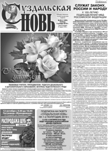 Газета основана 21 марта 1918 г. № 80 (11933) пятница, 5 октября 2018 г. Общественно политическая газета РАССРОЧКА* КРЕДИТ** без первоначального взноса *Рассрочку предоставляет ИП Низгуренко А.Л. (ОГРНИП 314682825500063). *Кредит предоставляет АО «ОТП Банк» г. Москва, ген.доверенность 3 2766 от 27.11.2014 г. *Акция действует 12.10.2018 г. Реклама. ОГРОМНЫЙ ВЫБОР НОВЫЕ МОДЕЛИ Норка • Мутон • Бобер ДУБЛЕНКИ 12 октября с 9.00 до 18.00 Гостиница «Молодежная» (г. Суздаль, ул. Ленина, д.104) г. Пятигорск Ленина, д.104) РАСПРОДАЖА ШУБ АКЦИЯ!*** Меняем старую шубу на новую. Практически без промедления после Октябрьской революции советское государство приступило к формированию новых институтов власти – своих министерств и ведомств. В полной мере это коснулось и такого силового ведомства как нынешнее МВД. Поэтому не случайно, что многие структуры, подразделения МВД РФ ведут отчёт от 1918 года. 5 октября текущего года исполняется 100 лет отделению уголовного розыска, 7 октября – штабу, 12 октября – отделению кадров ОМВД России по Суздальскому району. Сегодня мы расскажем о том, что из себя представляют подразделенияюбиляры, какие задачи они решают, какие люди работали в них и трудятся сейчас. Конечно, суздальские полицейские еще поздравят своих коллег с профессиональными праздниками и юбилейными датами, руководство отметит лучших. Мы же поздравляем сегодня вышеназванные коллективы и желаем их сотрудникам успехов в службе, здоровья, благополучия, семейного счастья! 5 октября 1918 года в целях охраны революционного порядка путем негласного расследования преступлений уголовного характера и борьбы с бандитизмом НКВД РСФСР принял положение «Об организации отдела уголовного розыска». В начале 1920-х годов к ведению уголовного розыска было отнесено раскрытие всех преступлений, не носивших политического характера. В мае 1931 года уголовный розыск был включен в состав органов милиции (при этом были периоды, когда он передавался НКВД, МГБ). В 1975-1980-х годах в структуре аппарата уголовного розыска были проведены существенные изменения. Созданы отделения по борьбе с наркоманией, отдел розыска преступников, отдел по особо важным делам, инспекция по делам несовершеннолетних, которая в 1989 году стала самостоятельной службой. В 1990-е годы создаются подразделения по борьбе с бандитизмом и другими проявлениями организованной преступности, по организации розыскной работы преступников и без вести пропавших граждан, борьбы с разбоями, грабежами, раскрытию преступлений, связанных с автотранспортом, кражами государственной и личной собственности, по борьбе с преступлениями против личности и имущественными преступлениями. Сегодня Главное управление уголовного розыска Министерства внутренних дел Российской Федерации (ГУУР МВД России) является самостоятельным структурным подразделением центрального аппарата МВД, обеспечивающим и осуществляющим в пределах своей компетенции функции министерства по выработке и реализации государственной политики и нормативно-правовому регулированию в области выявления, предупреждения, пресечения и раскрытия преступлений общеуголовной направленности, розыска лиц, организации и осуществления оперативно-розыскной деятельности. 7 октября 1918 года, принято считать Днем образования штабных подразделений в системе МВД РФ, когда приказом № 1 по Главному управлению Раб