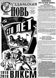 Газета основана 21 марта 1918 г. № 86 (11939) пятница, 26 октября 2018 г. Общественно политическая газета Уважаемые читатели! Мы на пороге празднования большой юбилейной даты: 29 октября - 100-летие ВЛКСМ. Наша память хранит не только годы, овеянные романтикой молодости, годы пребывания в комсомоле. Это целая эпоха в жизни нашей страны, когда комсомольцы сражались на фронтах Гражданской и Великой Отечественной, когда рождались комсомольские стройки, руками молодых возводились целые города. Теперь это уже история... Для многих из вас, чья трудовая биография начиналась на Суздальской земле, комсомол стал настоящей жизненной школой, где само время давало уроки мужества, добра и справедливости, воспитывало чувство ответственности за все, что происходит вокруг. Сегодня на страницах районной газеты «Суздальская новь» своими воспоминаниями делятся бывшие комсомольцы, которые жили и работали в городе Суздале и Суздальском районе. Читайте 2-5 стр. Плакат художника Михаила Белана. 1918 2018 ВЛКСМ От имени администрации и Совета народных депутатов Суздальского района сердечно поздравляем вас со 100-летием со дня образования Всесоюзного Ленинского Коммунистического Союза молодежи! День рождения комсомола много лет считался одним из важных государственных праздников. И сегодня для многих россиян, кто был членом этой молодежной организации, он не утратил свой идеологический смысл. Огромный вклад внесли комсомольцы и молодежь в создание экономического и оборонного могущества страны, в разгром германского фашизма и в послевоенное восстановление народного хозяйства. В годы войны комсомольцы проявили преданность Родине, высокую политическую и трудовую активность. Сегодня можно с уверенностью сказать, что все сделанное комсомольцами разных поколений не прошло бесследно, востребовано временем и может служить нравственным ориентиром для современной молодежи. Многие добрые комсомольские дела вписаны в историю развития науки, культуры и спорта нашего Суздальского района. Особую признательность в этот день мы выражаем нашим уважаемым ветеранам комсомола, которые по велению души и сердца всегда были впереди и в бою, и в труде. Через все годы и трудности вы пронесли это особое, дорогое чувство плеча, товарищества. Вы объединены крепким братством, преданностью своему делу. Вам есть, что вспомнить, и есть, чем гордиться. Оставаясь верными комсомольским традициям, вы отдаете свои силы, знания, жизненный опыт и богатейший опыт комсомола современной молодежи. Сердечно благодарим вас за верность своим идеалам и уважение к славной истории ВЛКСМ и от всей души желаем крепости духа, здоровья, комсомольского задора, неиссякаемой жизненной энергии и оптимизма, всего вам самого доброго! А.П. САРАЕВ, Глава администрации Суздальского района. В.В. КИРИЛЛОВ, Глава Суздальского района. КОМСОМОЛ - ЭТО НА ВСЮ ЖИЗНЬ! УВАЖАЕМЫЕ ВЕТЕРАНЫ КОМСОМОЛА, ЖИТЕЛИ СУЗДАЛЬСКОГО РАЙОНА! ДОРОГИЕ ДРУЗЬЯ! УВАЖАЕМЫЕ КОМСОМОЛЬЦЫ ВСЕХ ПОКОЛЕНИЙ! 29 октября отмечает 100-летие со дня своего основания самая массовая молодежная организация прошлого столетия - Всесоюзный Ленинский Коммунистический Союз Молодежи (ВЛКСМ). Почти все, кому сегодня сорок и более лет, в свое время прошли эту школу гражданственности и патриотизма. Это целая эпоха в жизни нашей страны. Комсомол, созданный в трудные годы Г
