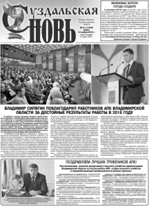 Газета основана 21 марта 1918 г. № 91 (11944) среда, 14 ноября 2018 г. Общественно политическая газета УВАЖАЕМЫЕ ЖИТЕЛИ ГОРОДА СУЗДАЛЯ! 3 декабря 2018 года истекает срок уплаты имущественных налогов (земельного, транспортного и налога на имущество физических лиц), начисленных за 2017 год. Всех, кто не получил квитанции на уплату налогов, просим обратиться в территориально обособленное рабочее место Межрайонной инспекции Федеральной налоговой службы России № 10 по Владимирской области в городе Суздаль по адресу: г. Суздаль, Красная площадь, д.1, 3-й этаж, контактный телефон 2-12-61. Налоговая служба проводит День открытых дверей для налогоплательщиков - физических лиц 30 ноября 2018 (пятница) с 9-00 до 20-00. Администрация города Суздаля. 9 ноября в городе Суздале прошло торжественное собрание, посвящённое Дню работника сельского хозяйства и перерабатывающей промышленности, который в этом году отмечался в нашей стране 14 октября (на снимках). Поздравить тружеников АПК приехали Губернатор Владимир Сипягин, его заместитель Юрий Трутнев, заместитель председателя Законодательного Собрания Дмитрий Рожков, главный федеральный инспектор Сергей Мамеев и депутат Государственной Думы Василий Власов. Поздравляя владимирских аграриев с профессиональным праздником, Владимир Сипягин отметил, что 2018 год они заканчивают с достойными результатами: «Общий объём собранного зерна по области из-за погодных условий составил 178 тысяч тонн. Наилучшие результаты показали сельскохозяйственные предприятия Юрьев-Польского, Собинского и Суздальского районов. В регионе собрано 72 тысячи тонн картофеля. Более половины этого объёма выращено в хозяйствах Меленковского района. Владимирская область в текущем году уверенно заняла 7 место по России по производству молока». Стабильные темпы развития демонстрирует пищевая промышленность региона. За 9 месяцев 2018 года индекс производства пищевых продуктов составил 107,7 процента, товаров собственного производства отгружено на сумму более 101 млрд. рублей. На 58 процентов в области увеличился выпуск шоколада, на 32 процента – кондитерских изделий. Есть яркие победы и у региональных племенных заводов: 10 наград высшей пробы завоевала в 2018 году на выставках различного уровня Государственная заводская конюшня, представившая владимирских тяжеловозов. Достойно продемонстрировали свои достижения собинские и ковровские сельскохозяйственные предприятия, занимающиеся разведением племенного крупного рогатого скота, а также Верхневолжский Федеральный аграрный научный центр в Суздальском районе. «В рамках реализации поручения Президента Владимира Путина об увеличении к 2024 году экспорта сельхозпродукции более чем в два раза в нашей области совместно с Министерством сельского хозяйства разрабатывается региональная программа развития экспорта, где особое внимание уделяется развитию молочного и мясного скотоводства, а также направлениям, связанным с глубокой переработкой сельскохозяйственного сырья», – отметил Владимир Сипягин. Первыми шагами в этом направлении можно назвать реализацию пилотного проекта по строительству животноводческой фермы на 400 коров в СПК «Пионер» Судогодского района. Договор в рамках областной лизинговой программы на 140 млн. рублей уже заключён, строительные работы начаты. В 2019 году поддержка мясного животн