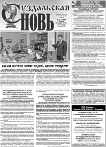 Газета основана 21 марта 1918 г. № 92 (11945) пятница, 16 ноября 2018 г. Общественно политическая газета ООО «Надежда+» Клиника «ТВОЙ ДОКТОР» г.Владимир 24 ноября 2018 г. с 9.00 в поликлинике на базе Суздальской районной больницы БУДУТ ВЕСТИ КОНСУЛЬТАТИВНЫЙ ПРИЕМ ВРАЧИ-СПЕЦИАЛИСТЫ ИЗ г. ВЛАДИМИРА: КАНАЕВ ОЛЕГ ВЛАДИМИРОВИЧ - врач-онколог-маммолог ПЛАТОНОВА НАТАЛЬЯ СЕРГЕЕВНАврач-гинеколог и УЗ-диагностики (УЗИ органов брюшной полости, простаты, щитовидной и молочных желез, гинекологическое, сердца) ПРИЁМ ПЛАТНЫЙ ПО ПРЕДВАРИТЕЛЬНОЙ ЗАПИСИ ПО ТЕЛЕФОНУ 8 (49231) 2-01-22. САЙТ: www.tvoi-doctor33.ru. ВНИМАНИЕ! ИМЕЮТСЯ ПРОТИВОПОКАЗАНИЯ, ПРОКОНСУЛЬТИРУЙТЕСЬ СО СПЕЦИАЛИСТОМ. Лиц. №ЛО-33-01-002688 от 26.10.2018 выд. деп. здравоохр. адм. Влад. обл. Реклама Наша газета уже писала о том, что Суздаль принимал участие во Всероссийском конкурсе на право получения поддержки в целях реализации лучших проектов создания комфортной городской среды в муниципальных образованиях, имеющих статус исторических поселений и малых городов. В феврале 2018 года суздальцы сами путем голосования выбрали общественную территорию, которая в первую очередь требует благоустройства - Зарядье (территория вокруг Торговых рядов). Среди 98 участников Всероссийского конкурса малых городов и исторических поселений в категории «Исторические поселения» стали победителями 20, среди них Суздаль с проектом благоустройства территории, прилегающей к Торговым рядам. По итогам конкурса нашему городу выделено 50 млн. рублей. Определить приоритетные объекты для благоустройства предложил собравшимся глава администрации г. Суздаля Сергей Сахаров, пояснив, что на конкурс был представлен не сам проект, а концепция развития пространства центра города возле Торговых рядов. Глава администрации отметил, что собственно проектно-сметная документация будет КАКИМ ЖИТЕЛИ ХОТЯТ ВИДЕТЬ ЦЕНТР СУЗДАЛЯ? разработана после обсуждения и разработчики учтут в ней пожелания жителей. Концепцию благоустройства территории, прилегающей к Торговым рядам, подготовили московская архитектурная школа «Марш Лаб» и бюро «Рождественка», представитель которого Михаил Разумовский и представил ее присутствующим. Она включает в себя детальную схему восстановления историкоградостроительной и природной среды: реновацию территории западной стороны Торговых рядов, благоустройство пространств восточной стороны Торговых рядов, приспособление под современное использование трех неактивных объектов (домов по адресам ул. Ленина, д. 51 и 53 и ул. Варганова, д.1). В ходе обсуждения концепции сразу стало ясно, что на все, предложенное разработчиками, денег не хватит, поэтому была поставлена конкретная задача определить с помощью голосования, что нужно делать в первую очередь. Было предложено 11 объектов для благоустройства. Голоса распределились следующим образом: - пешеходная дорожка за Торговыми рядами – 51 голос; - смотровая площадка за Торговыми рядами – 48 голосов; - сквер около Торговых рядов – 45 голосов; - мост через реку Каменка к Ильинскому лугу – 45 голосов; - пешеходная тропа по лугу – 45 голосов; - территория около Кресто-Никольской церкви – 29 голосов; - благоустройство валов – 19 голосов, - дома по адресам: ул. Ленина, д.51 и 53 - 4 голоса. За три объекта никто не проголосовал (ул. Лебедева, д.1, пешеходные тропы по южному валу и историческому рву). В свою очередь, жи