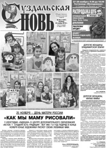 Газета основана 21 марта 1918 г. № 94 (11947) пятница, 23 ноября 2018 г. Общественно политическая газета «КАК МЫ МАМУ РИСОВАЛИ» РАССРОЧКА* КРЕДИТ** без первоначального взноса *Рассрочку предоставляет ИП Низгуренко А.Л. (ИНН 682805536719 ОГРНИП 314682825500063). **Кредит предоставляет АО «ОТП Банк» г. Москва, лицензия на осуществление банковских операций № 2766 от 27.11.2014 г. ***Акция действует 27-28 ноября 2018 г. Реклама. ОГРОМНЫЙ ВЫБОР НОВЫЕ МОДЕЛИ Норка • Мутон • Бобер ДУБЛЕНКИ 27-28 ноября с 9.00 до 18.00 Гостиница «Молодежная» (г. Суздаль, ул. Ленина, д.104) г. Пятигорск Ленина, д.104) РАСПРОДАЖА ШУБ АКЦИЯ!*** Меняем старую шубу на новую. Всегда рисунок готовится сюрпризом к празднику. И после вручения мамы фотографируются со своими портретами и их авторами. И неизменно это вызывает бурю эмоций и у детей, и у родителей. Портрет каждой мамы ВСЕГДА узнаваем! Лучшие работы неоднократно участвовали во Всероссийских дистанционных конкурсах и получали призовые места. А выставка «Как мы маму рисовали» была показана на областном празднике ко Дню матери. Немного о некоторых наших сегодняшних мамах-«моделях»: Бабакова Татьяна Владимировна работает в «Истоке» логопедом, а сын-фантазёр с удовольствием творит в изостудии «Ладушки». Фокина Ольга Игоревна ещё школьницей посещала занятия изостудии, и ей даже посчастливилось выступать на международном форуме «Одарённые дети» в Москве. А её детские работы экспонируются в детском музее игрушки «Истока». В этом году она привела в изостудию, к своему любимому педагогу дочерей Машеньку и Анечку. Девочки только в начале творческого пути. Портрет мамы - их первая серьёзная работа. Нет сомнений, что свои портреты, нарисованные их любимыми детьми, мамы будут хранить всю жизнь, показывать родным, близким, знакомым и очень ими гордиться. Ольга ПЕРЕПЕЛИЦЫНА, руководитель изостудии «Ладушки» . У ИЗОСТУДИИ «ЛАДУШКИ» В ЦЕНТРЕ ДОПОЛНИТЕЛЬНОГО ОБРАЗОВАНИЯ «ИСТОК» Г. СУЗДАЛЯ ЕСТЬ ТРАДИЦИЯ : ВОТ УЖЕ 7-й ГОД ПОДРЯД В КОНЦЕ НОЯБРЯ ЮНЫЕ ХУДОЖНИКИ РИСУЮТ СВОИХ ЛЮБИМЫХ МАМ. Сердечно поздравляю вас с одним из самых тёплых и душевных праздников – Днём матери! Мама – первое и, пожалуй, самое важное слово в жизни каждого человека. Это начало всех начал, опора и надежда семьи. От нравственного, духовного и физического здоровья матерей, которое они передают своим детям, во многом зависит будущее нашей страны. Именно поэтому развитие демографической политики, поддержка материнства и детства, помощь семьям остаются важнейшими задачами как федеральной, так и региональной власти. В этот праздничный день – особые слова благодарности матерям-героиням, многодетным мамам, приёмным матерям. Земной поклон вам, дорогие хранительницы семейных традиций, за ваш неустанный труд! Предстоящий праздник – прекрасный повод собраться в семейном кругу, повиниться за доставленные огорчения, наполнить дом душевной теплотой и искренним весельем. А у тех, кто волею судьбы находится далеко от родительского очага, есть возможность позвонить маме и сказать тёплые слова благодарности за подаренную жизнь. Милые мамы! Пусть ваши дети будут успешными, внимательными и любящими, а ваша жизнь будет полна благополучия и гармонии. От всей души желаю вам больше светлых дней и поводов для радости! В.В. СИПЯГИН, Губернатор области. ДОРОГИЕ ЖЕНЩИНЫ ВЛАДИМИРСКОЙ ЗЕМЛИ! ДОРОГИЕ ЖЕНЩИНЫ, МИЛЫЕ МАМЫ! От им