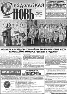 Газета основана 21 марта 1918 г. № 95 (11948) среда, 28 ноября 2018 г. Общественно политическая газета БЕЗОПАСНАЯ ЭКСПЛУАТАЦИЯ ГАЗОВЫХ БАЛЛОНОВ Во Владимирской области в качестве единственной уполномоченной организации по обеспечению населения сжиженным углеводородным газом для коммунально-бытовых нужд по регулируемым государством ценам выступает компания ВЛАДНЕФТЕГАЗ (ООО «ЮТА-АГ»). Ежегодно Департамент цен и тарифов администрации по Владимирской области устанавливает розничные тарифы на газ для населения, обязательные к применению на территории области. На основании Постановления ДЦТ от 28.12.2017 г. №63/5 с 01.01.2018 г. по 31.12.2018 г. установлены предельные розничные цены на сжиженный газ, реализуемый населению, в частности, стоимость баллонного газа самовывозом населению составляет 670 рублей за 1 баллон емкостью 50 л. ЗАПРАВИТЬ БАЛЛОНЫ МОЖНО ПО АДРЕСАМ: 1. ГНС г. Александров, Двориковское шоссе 2. ГНП г. Владимир, мкр. Юрьевец, ул. Ноябрьская, д. 141 А 3. АГЗС Газпром, г. Владимир, ул . Куйбышева, д. 22 4. АГЗС Газпром, Петушинский район, 122 км ФАД М7, слева 5. АГЗС Газпром, Суздальский р-н, объездная на г. Иваново 6. ГНП г. Муром, ул. Механизаторов, д. 54 Д 7. АГЗС Газпром, Меленковский р-н, на ПК автодороги Нижний Новгород-Рязань 8. АГЗС Газпром, г. Ковров, ул. Еловая, д. 1 Б 9. АГЗС Газпром, Вязниковский р-н, 290 км ФАД М7, справа Для получения дополнительной информации вы можете позвонить по бесплатному номеру телефона: 8-800-250-11-04 СПРАВКА: ВЛАДНЕФТЕГАЗ (ООО «ЮТА-АГ»), г. Владимир, ул. Дворянская, д. 27а, корп.7, офис 25. Телефон: +7 (4922) 37-12-15. Сайт: www.vladimirgaz.ru. E-mail: info@vladimirgaz.ru vk.com/clubneftegazvladimir • #neftegazvladimir Реклама Во Владимире состоялся гала-концерт ежегодного областного конкурса эстрадной песни «Звезды в ладонях». За время проведения конкурс уже объединил несколько тысяч юных талантов, и с каждым годом количество желающих принять в нем участие растет. В этот раз в оргкомитет поступило более 150 заявок из разных районов Владимирской области. Возраст артистов – от 5 до 20 лет. Лучшие номера по итогам двух отборочных дней были представлены на гала-концерте. По правилам фестиваля, победителей выбирают в пяти возрастных номинациях, среди ансамблей и сольных исполнителей. Суздальский район на галаконцерте представляли два детских творческих коллектива - театр эстрадной песни «Алфавит» из села Новое и образцовая эстрадная студия «Апельсин» из поселка Садовый. Участницы коллектива из поселка Садовый исполнили на сцене песню «Хорошие девчата». Выступление очень понравилось зрителям и жюри. Результат - второе место среди ансамблей в возрастной категории 7-9 лет. Ансамбль из села Новое выступил с песней «Птичка-синичка» и поразил зрителей и судей тем, что девочки не только пели, но и играли на музыкальных инструментах. Выступление принесло театру эстрадной песни «Алфавит» победу в номинации «ансамбли в возрасте 10-12 лет». Конкурс «Звезды в ладонях» проходит в рамках долгосрочной программы депутата Госдумы Григория Викторовича Аникеева «Стань успешным – учись новому!». По мнению депутата, очень важно поддерживать подрастающее поколение. - Цель этого мероприятия – предоставить ребенку площадку для развития, создать особенную творческую среду, в которой он мог бы раскрыться, поверить в собственные силы, - говорит депутат Госдумы, председатель общественной организации «Милосердие и порядок» Гр